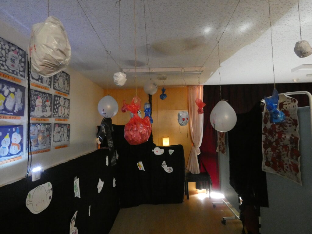 何やら薄暗いこの部屋は不気味な雰囲気・・・天井にはお化けがぶら下がっています👻