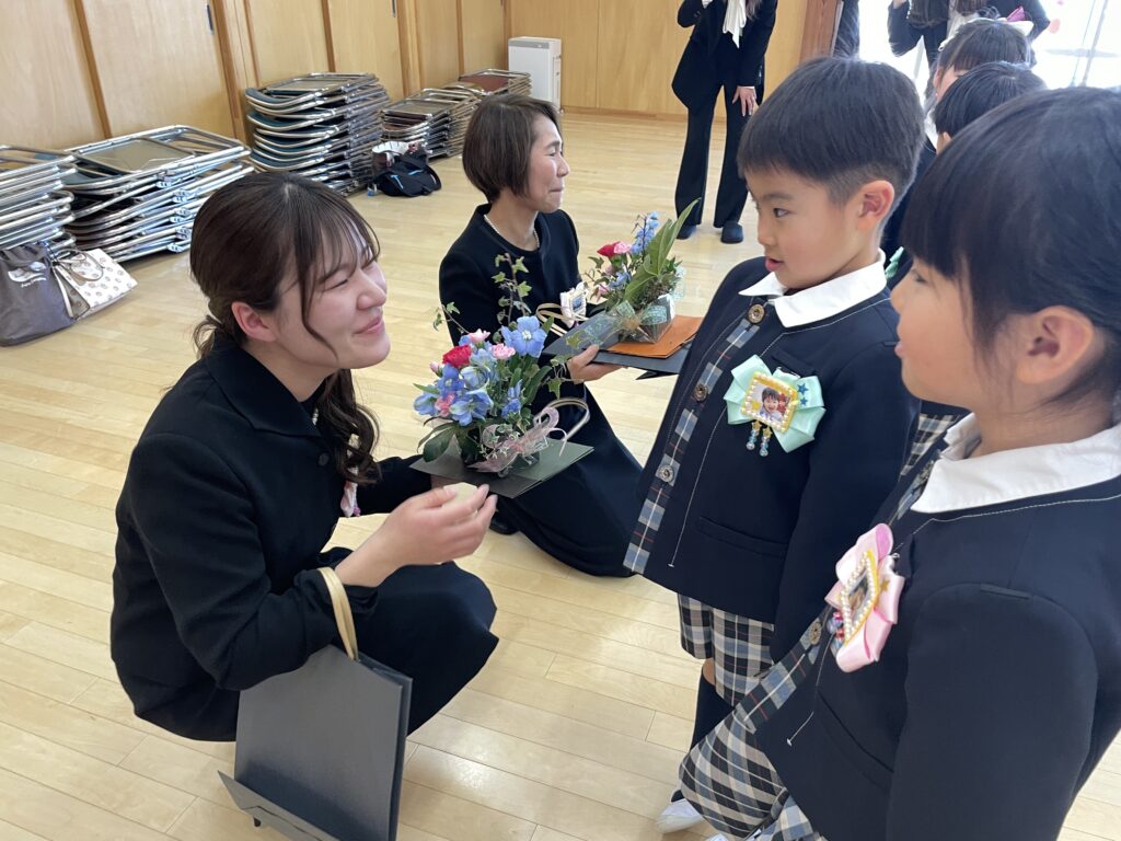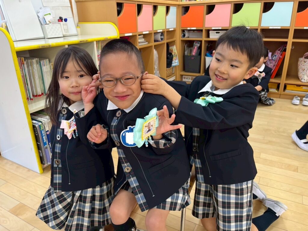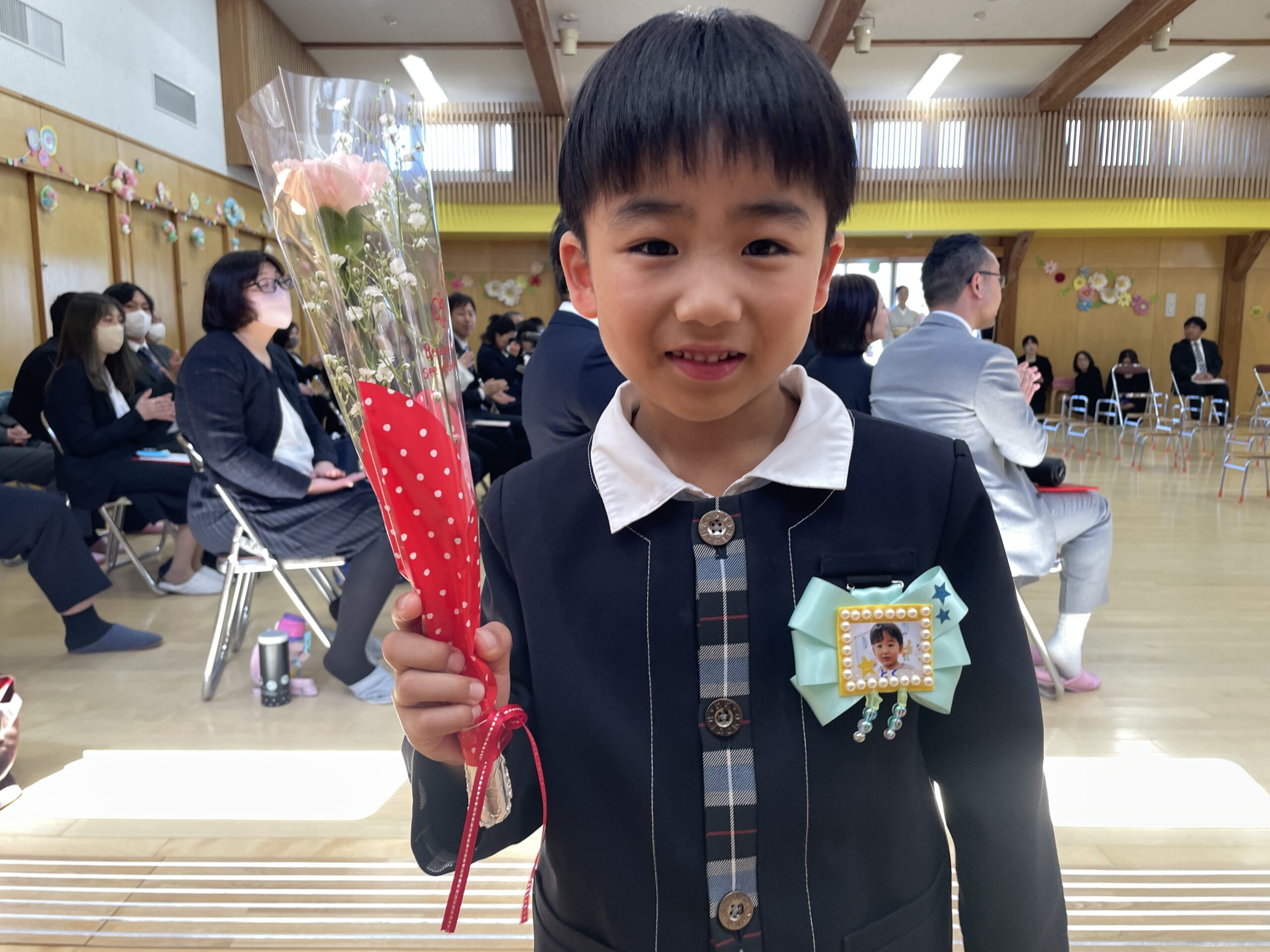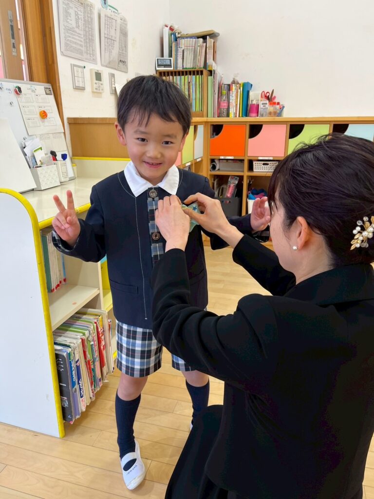 式の前に、担任の先生から手作りのコサージュを付けてもらいます。このコサージュには、入園当初の子どもたちの写真が貼られています📛
