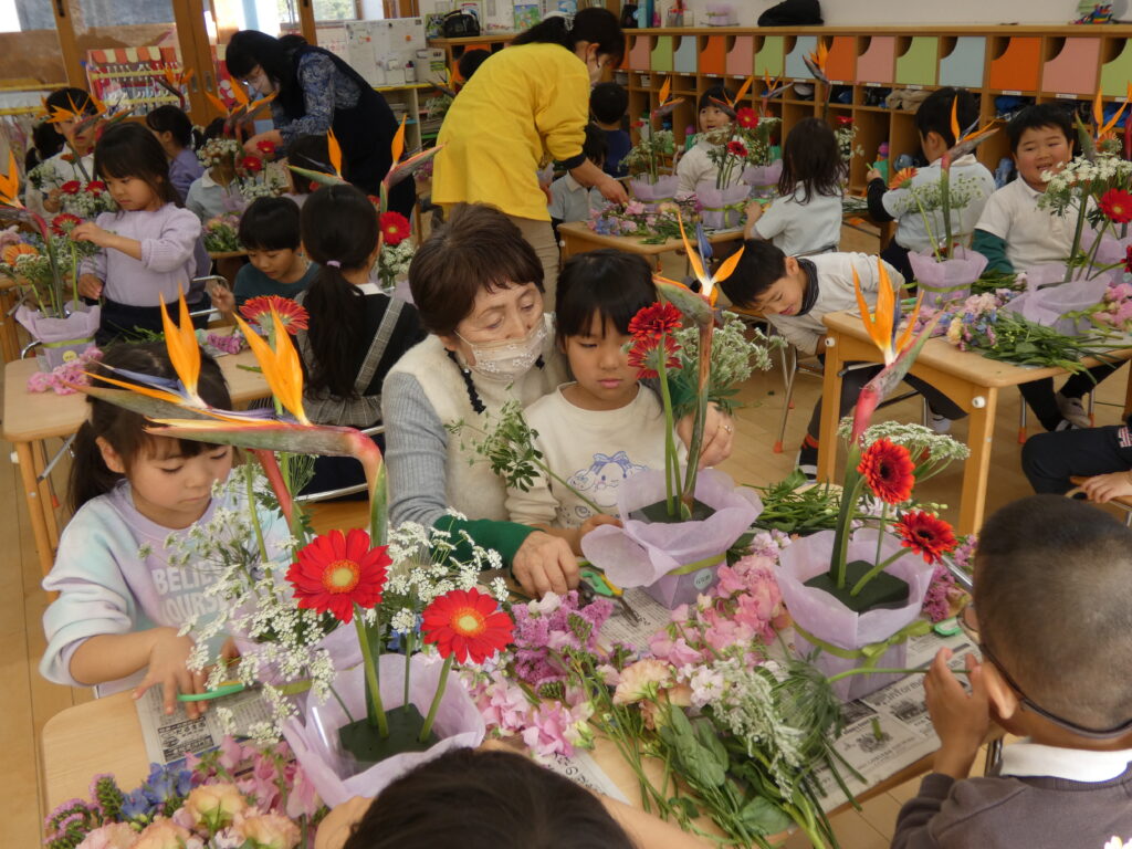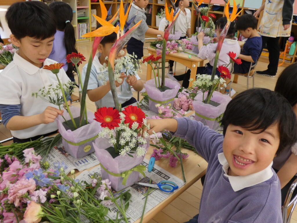 これらは昨日、生花教室でぞう組さんが生けたお花なんです☝️