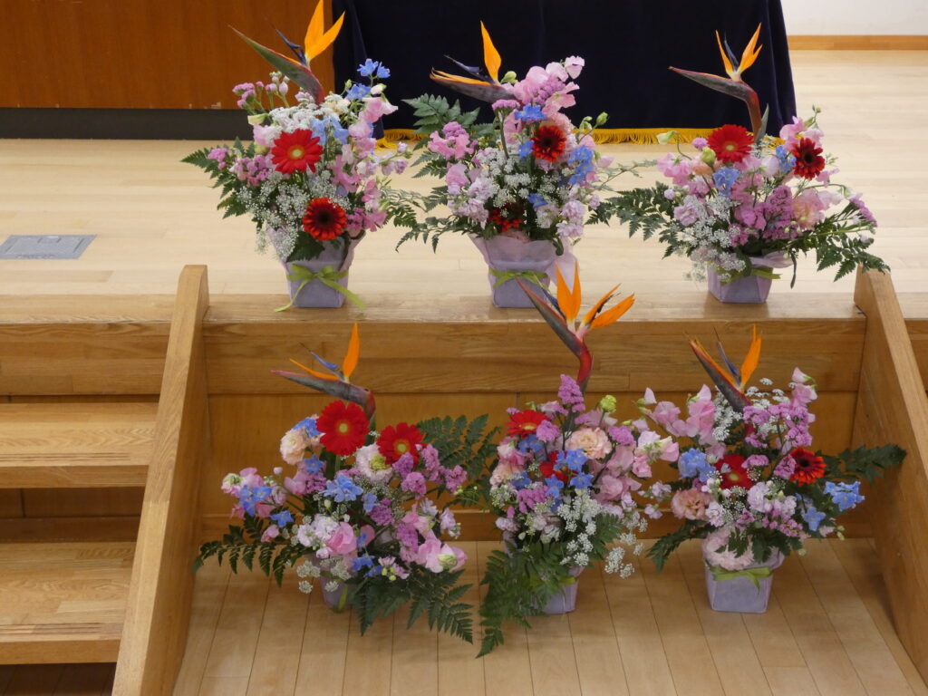 先生たちの手作り壁面の他に、綺麗なフラワーアレンジメントが飾られています💐