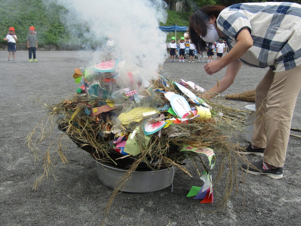 七夕が終わり、梅雨の合間におたき上げです!あんなに大きな笹飾りは、すっかり小さくなりました。でもみんなの願い事をいっぱい持ってお空に帰るのを待っています。短冊さんみんなのお願い事よろしくね☆