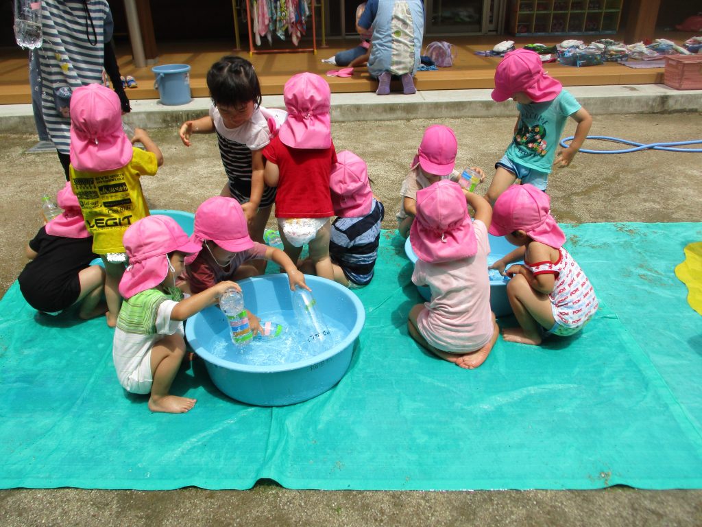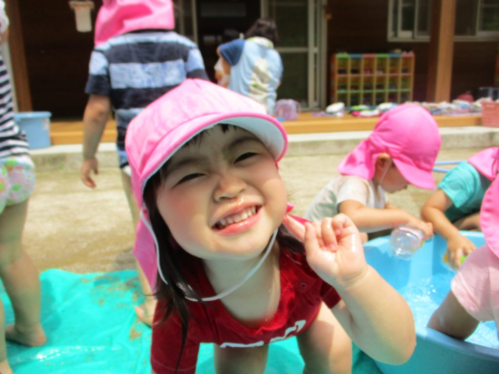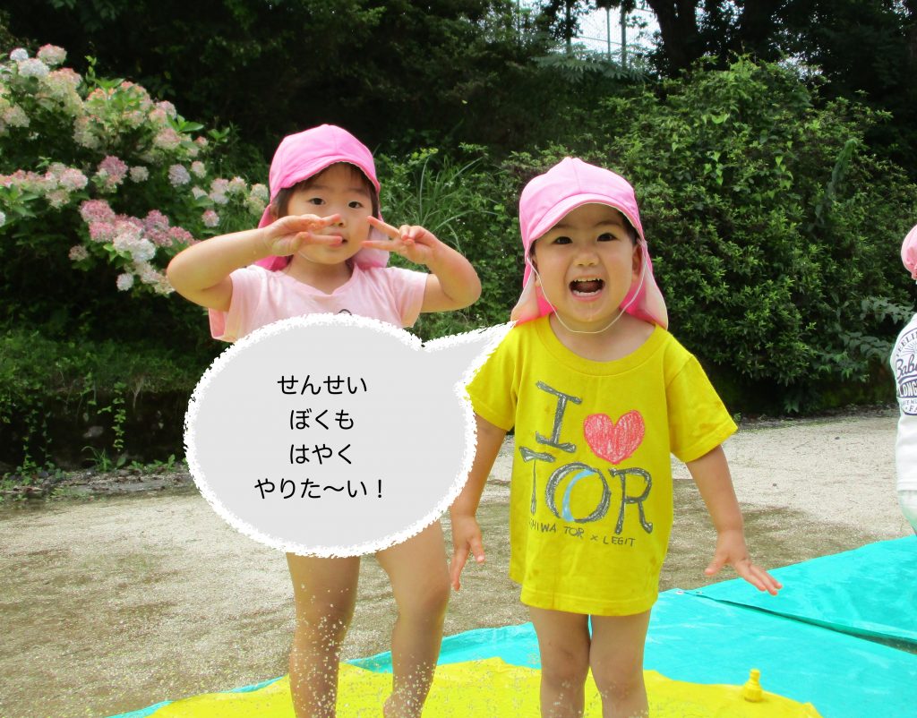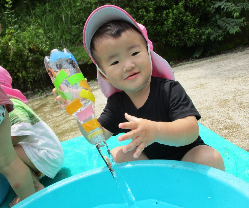 今年度はコロナウイルスの影響で、園の大きいプールはお預けです。どのクラスの先生たちも、身近な道具を使って、園児たちが楽しめる水遊びを考えています。もうすぐ梅雨明けです。暑い夏を1号認定児さんも一緒にみんなで楽しみましょう!