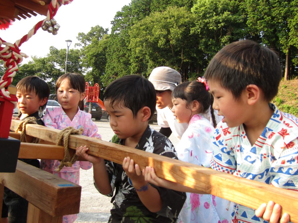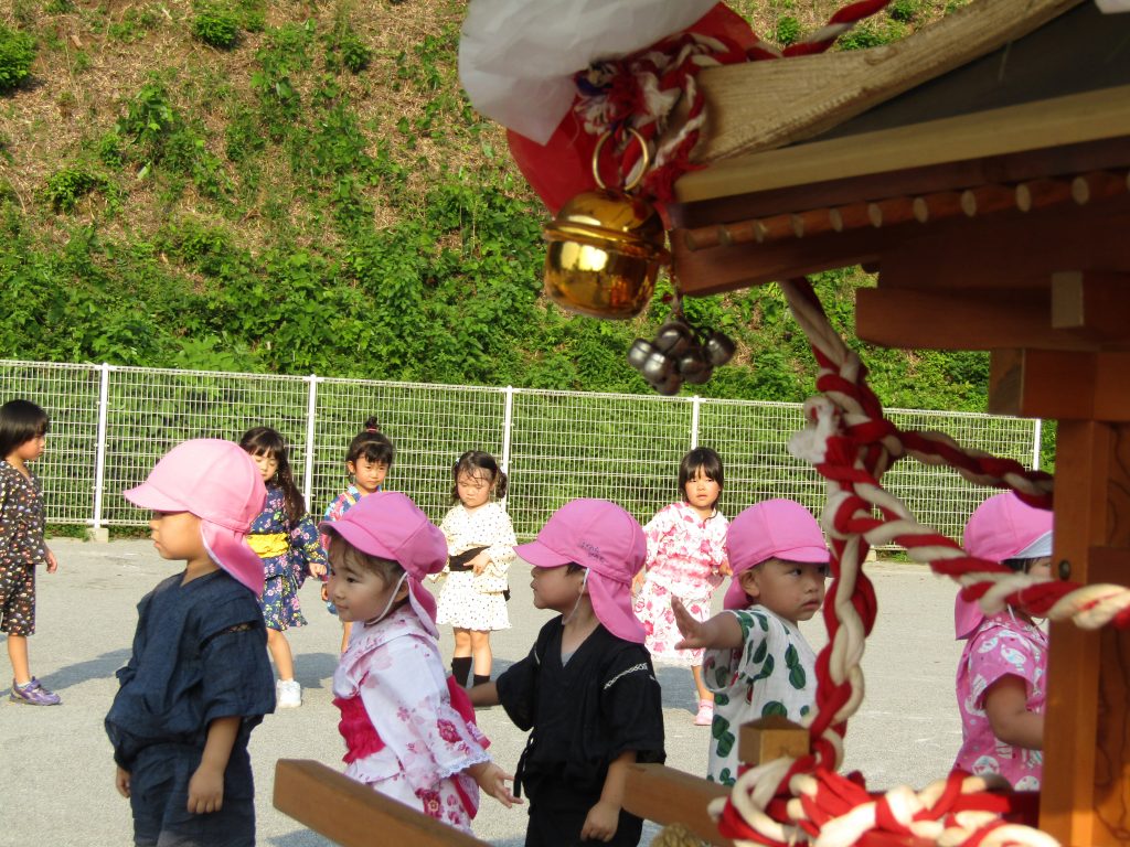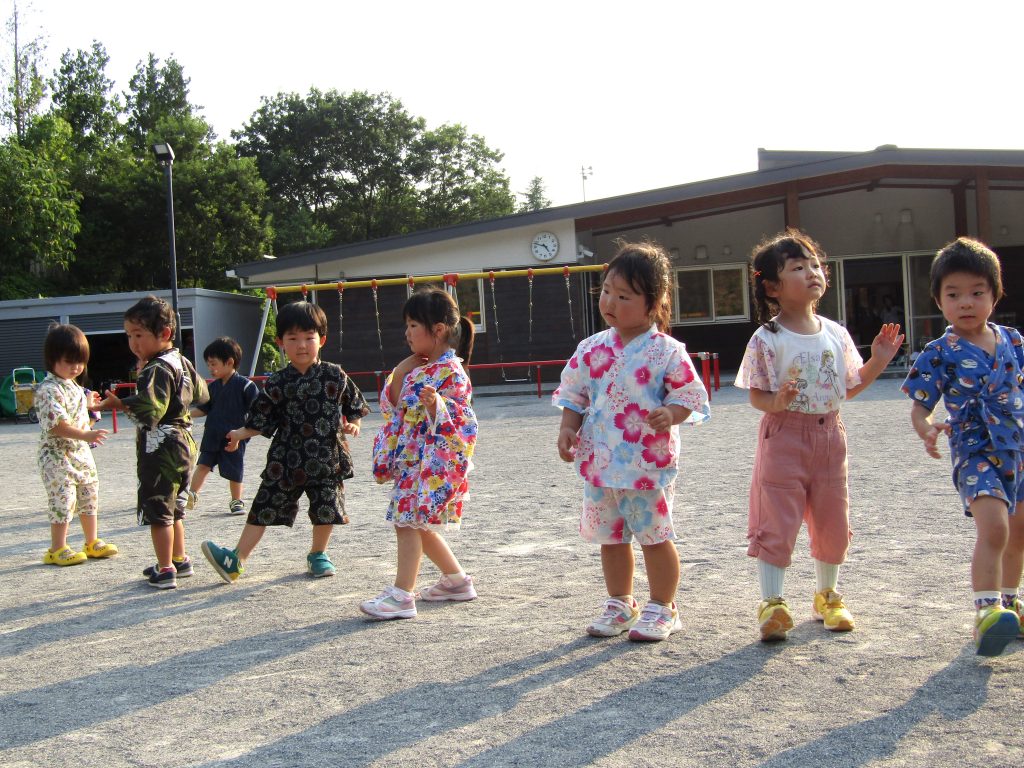 長い梅雨が明け、やっと夏らしい日差しが戻りました。甚平や浴衣を着た園児たちが、「おはようございます!今日はお祭りだよ!」と元気に登園してきました。気温がぐんぐん上がり、日差しもジリジリ・・・園児たちは大丈夫かな?のぞいてみましょう!