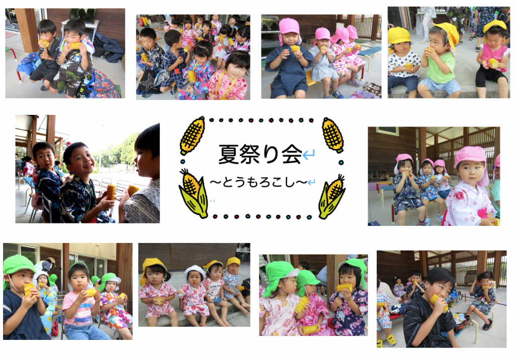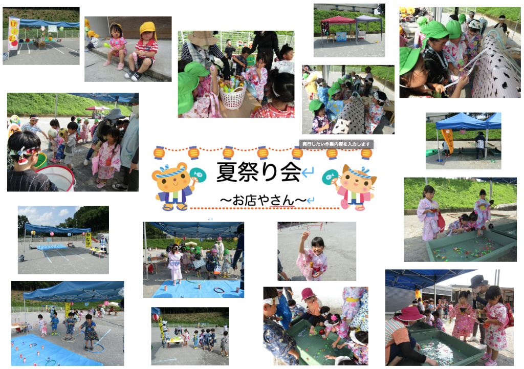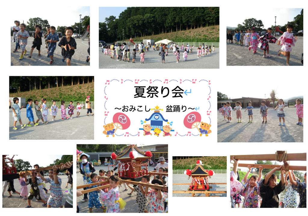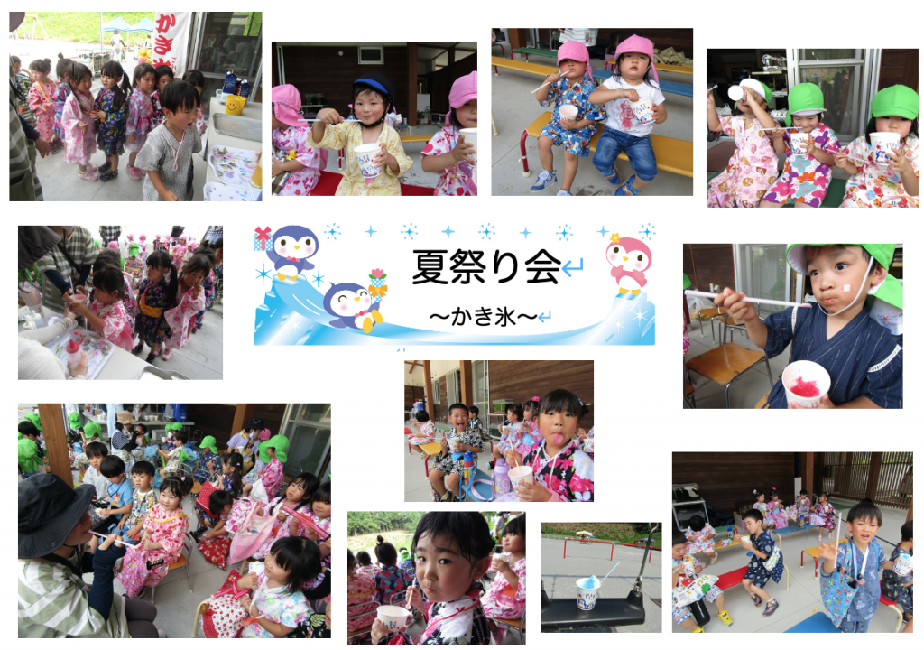 夏祭り会写真集! 2020 8/21 ニュース 行事 〜夏祭りの思い出〜 2020年8月4日 先日の夏祭り会は、浴衣や甚平姿の園児たちが屋台やかき氷、おみこしに盆踊りと目一杯楽しみました。今日は写真の一部を張り出し写真にまとめました。ぜひご覧ください! お店やさんの売り子さんはぞう組さんです!お友達といっしょに回る屋台は最高! かき氷の一番人気は「イチゴ」でした!「レモン」は女の子に人気でした☆ 調理員さんたくさんたくさんゆでてくれました!甘くておいしかったね。 夏の風物詩の盆踊りが鳴り響き、おみこしはぞう組さんが威勢よく担ぎました! ニュース 行事 URLをコピーしました! ピタゴラ装置で遊ぼう! 大成学園いなだこども園 アート・ギャラリー in the Summer コメント コメントする コメントをキャンセルコメント ※ 名前 ※ メール ※ サイト 次回のコメントで使用するためブラウザーに自分の名前、メールアドレス、サイトを保存する。 上に表示された文字を入力してください。 Δ