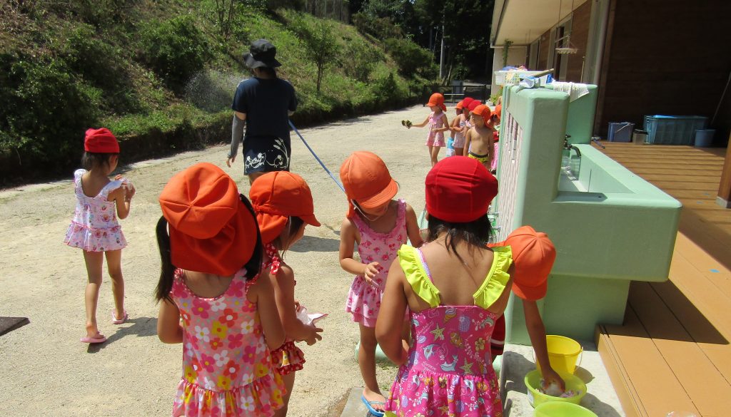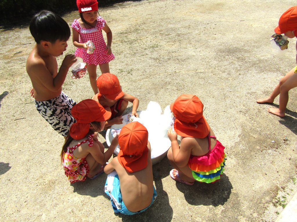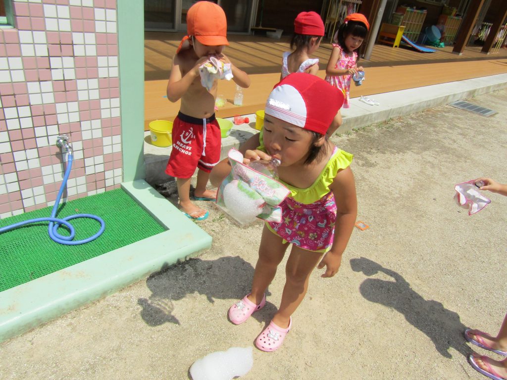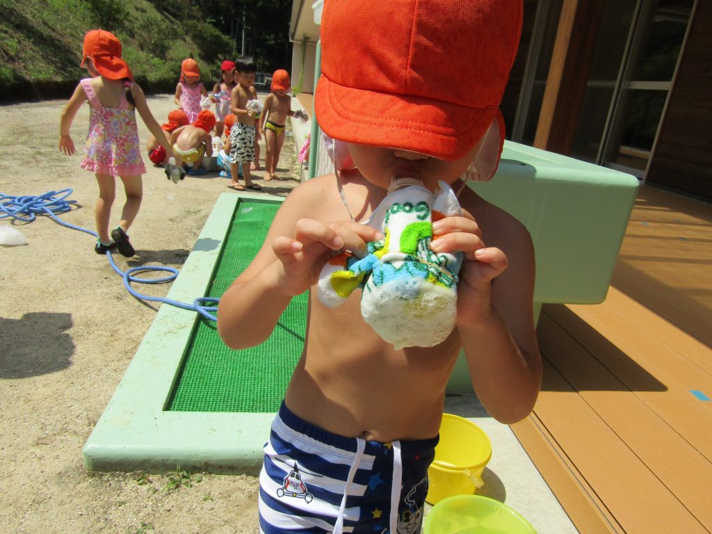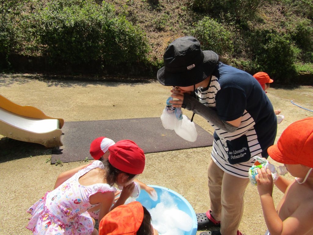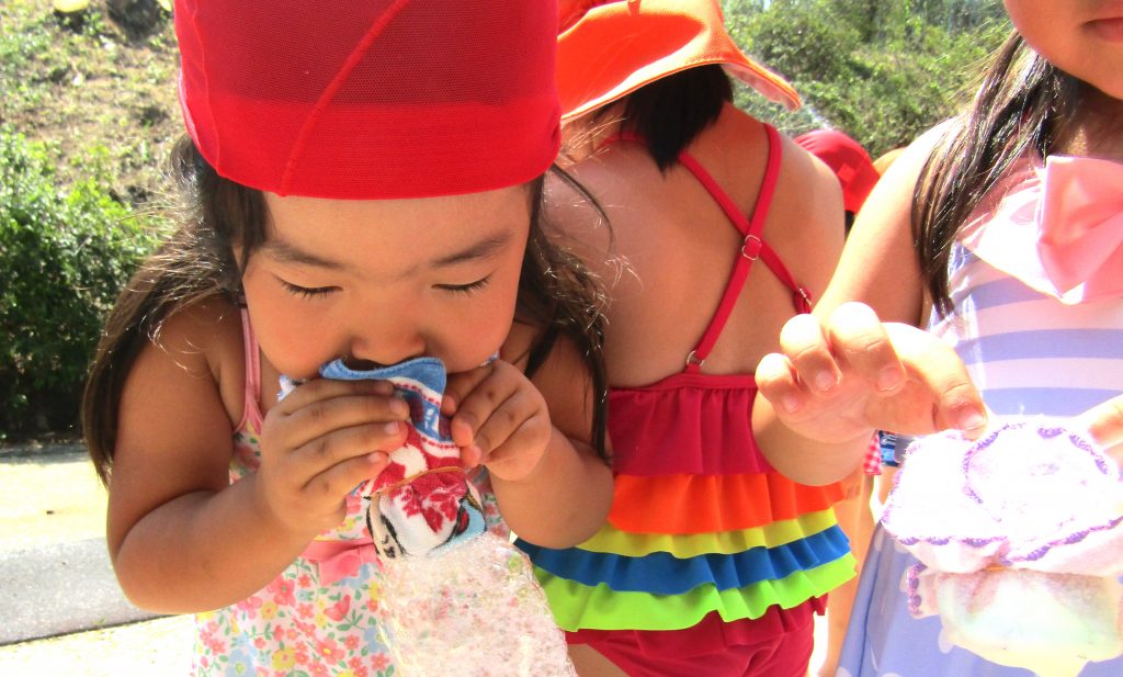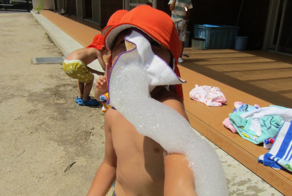 今回は、大中小のペットボトル のほかに、丸い切り口のペットボトル、四角い切り口のペットボトル 、ヤクルトやジョアの容器も使って、泡の出方を観察しました。息の吹き方で泡の出方や、つながり方が違うこと、泡同士がくっつくことを発見しました。泡風呂の泡を、タオルの代わりに風船を使ったペットボトル 空気砲で泡を飛ばしたり、使ったタオルを洗濯したり、最後まで盛りだくさんの活動でした。この実験はおうちにあるものでを使って、お風呂で簡単にできます。ぜひご家庭で試してくださいね。