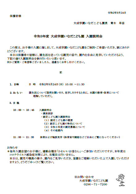 令和3年度入園説明会のお知らせ 2020 9/23 ニュース 行事 9月24(木)に令和3年度入園説明会を大成学園いなだこども園遊戯室にて行います。台風の接近により、天候が不安定になると予想されますので、どうぞお気をつけていらっしゃってください。 ニュース 行事 URLをコピーしました! 運動会の練習 十五夜 コメント コメントする コメントをキャンセルコメント ※ 名前 ※ メール ※ サイト 次回のコメントで使用するためブラウザーに自分の名前、メールアドレス、サイトを保存する。 上に表示された文字を入力してください。 Δ