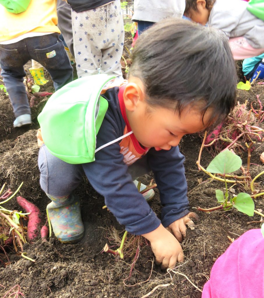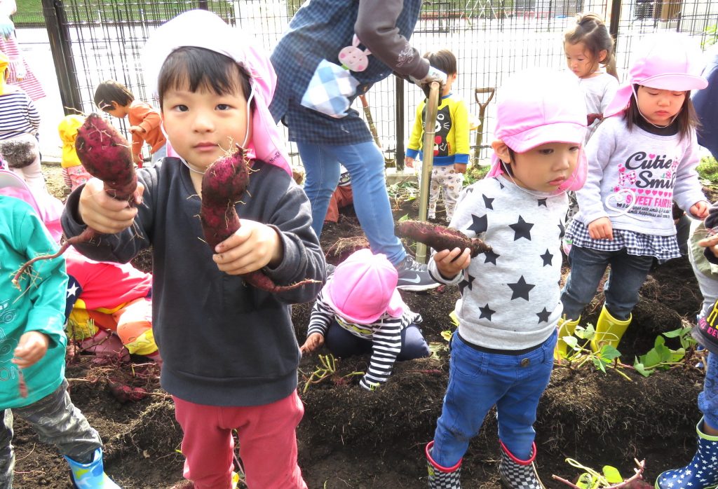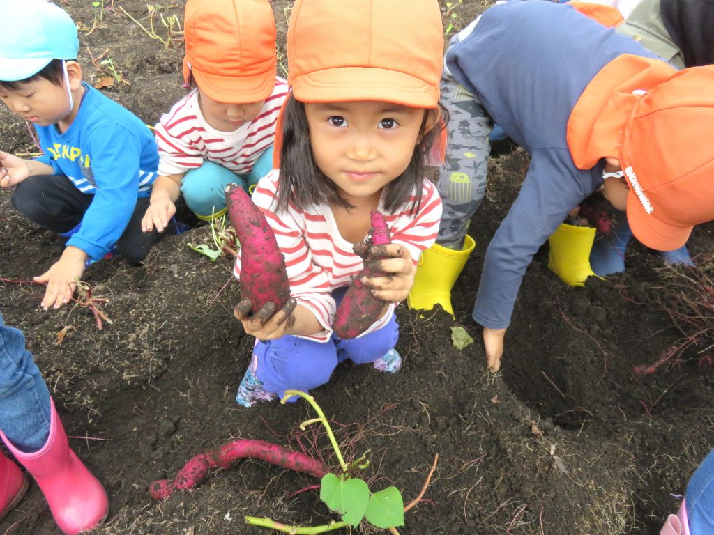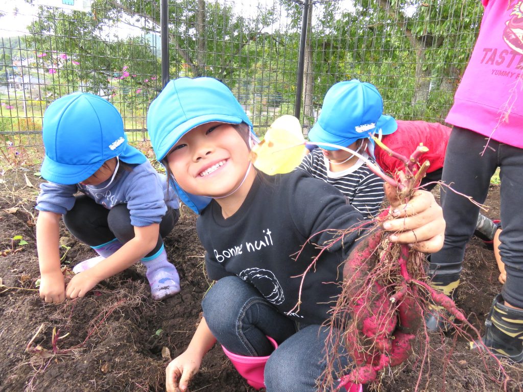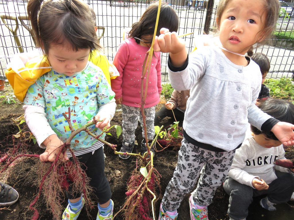 苗植えからお世話をしてきたお芋がこんなに大きくなりました!土の中から真っ赤なお芋が出てくるたびにみんな笑顔♪ひよこ組のお友達はこんなにたくさんのお芋を見るのは初めてかな?興味津々のお友達とちょっぴり怖がってしまったお友達、お芋をゲットして喜ぶお友達!いろいろな表情が見られました!たくさんのお芋の中からお持ち帰りのお芋を選びました。「早くおうちの人に見せたいな〜♪」「どんなお料理にしてもらおうかな?」おうちに帰るまで楽しみは続きます。
