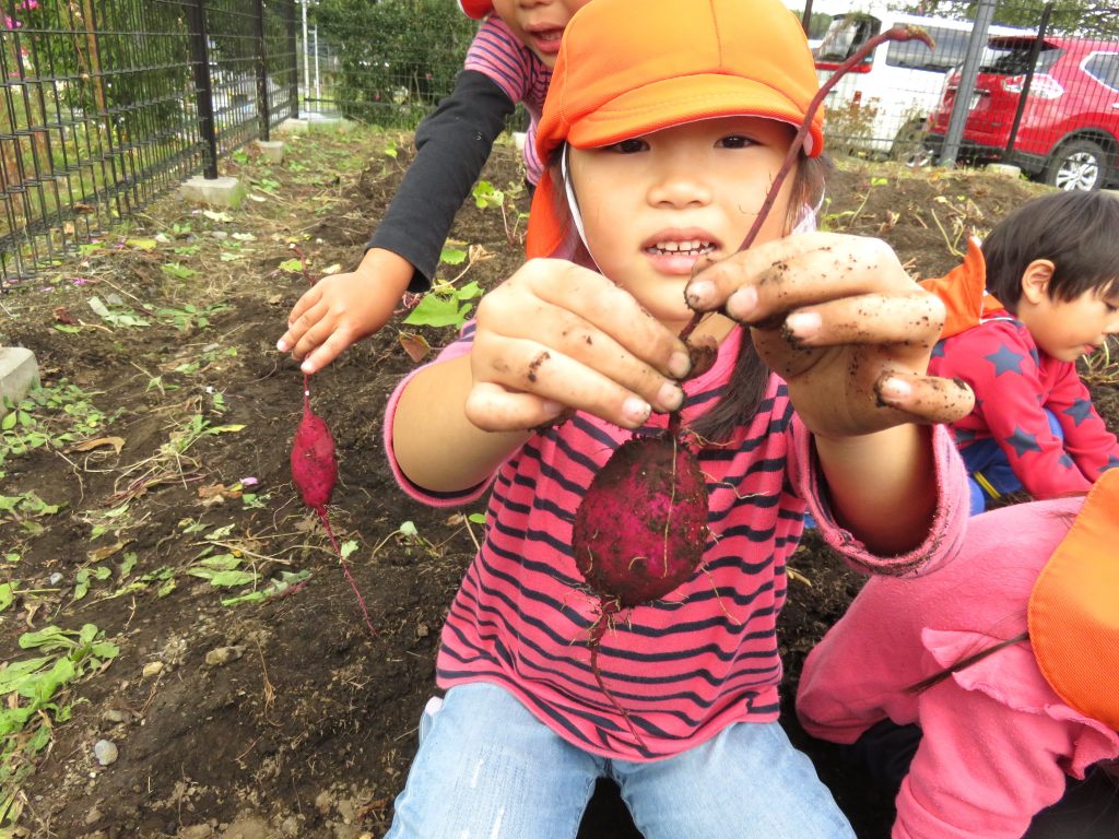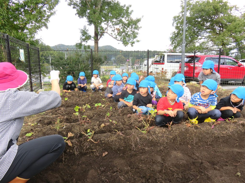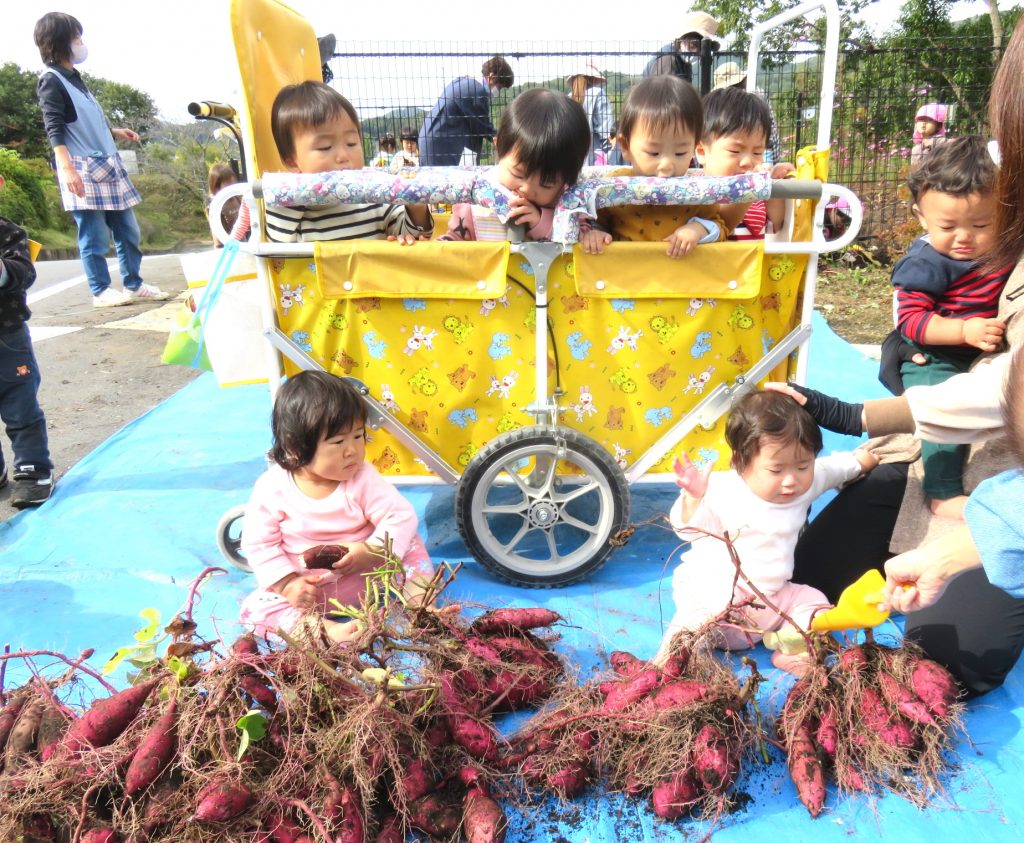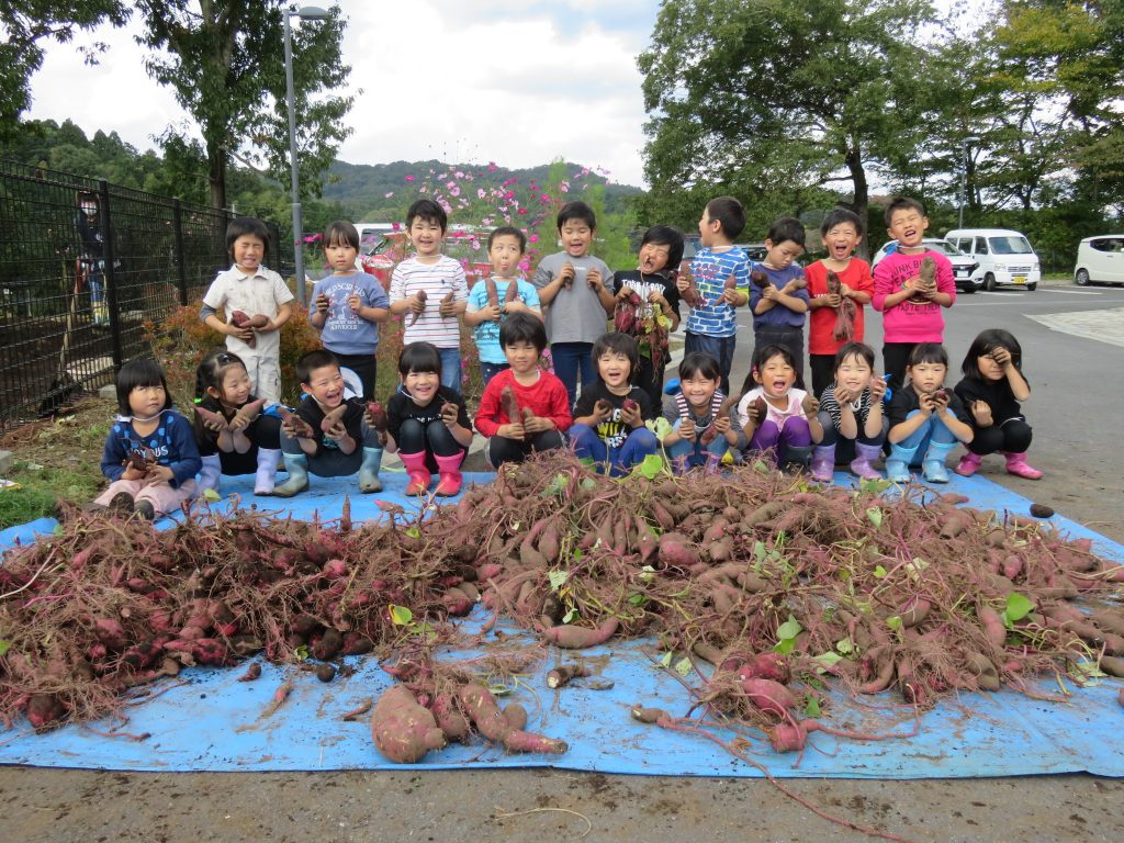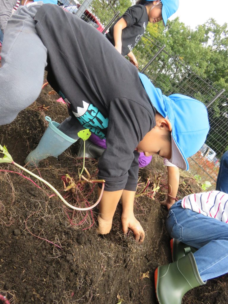 苗植えからお世話をしてきたお芋がこんなに大きくなりました!土の中から真っ赤なお芋が出てくるたびにみんな笑顔♪ひよこ組のお友達はこんなにたくさんのお芋を見るのは初めてかな?興味津々のお友達とちょっぴり怖がってしまったお友達、お芋をゲットして喜ぶお友達!いろいろな表情が見られました!たくさんのお芋の中からお持ち帰りのお芋を選びました。「早くおうちの人に見せたいな〜♪」「どんなお料理にしてもらおうかな?」おうちに帰るまで楽しみは続きます。
