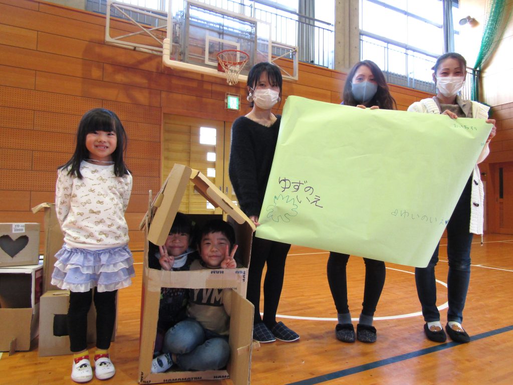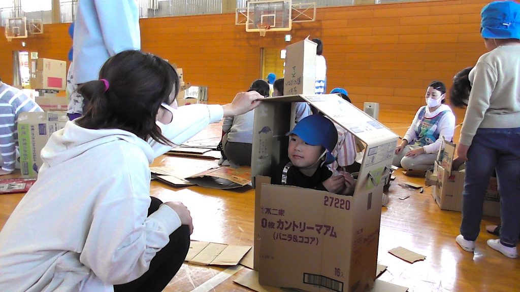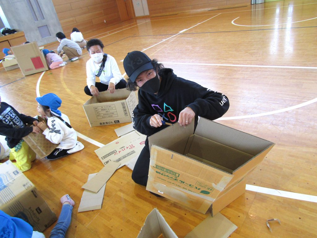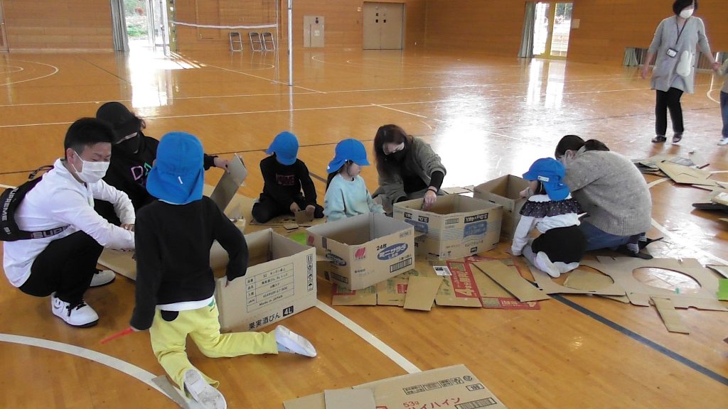 ぞう組さんの保育参加は、のりもテープも使わない制作なので、たくさんの段ボールを前に、「どうやってつなげる?」「うまく乗せられない!」「ここを切ればいい?」様々な疑問がうまれました。保護者や先生がうまくヒントを出し、大きな作品を作ることができました。段ボールとハサミがお家にありましたら、ぜひやってみてくださいね!