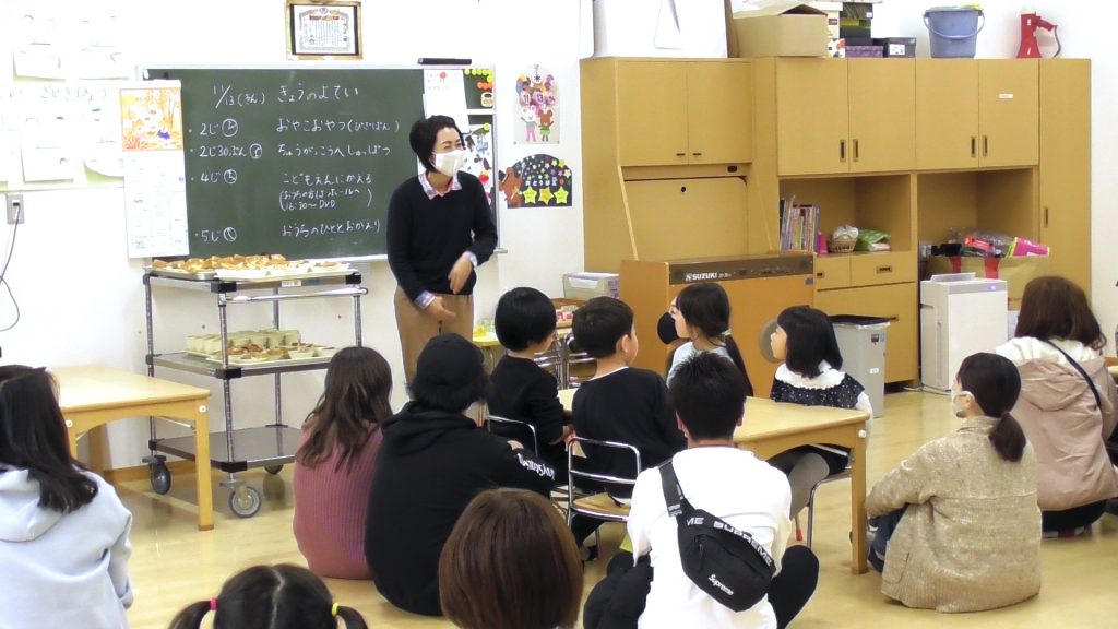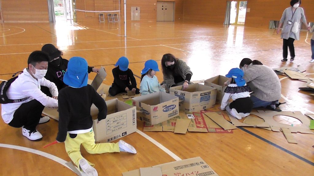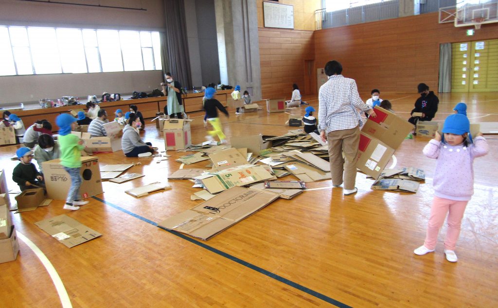 コロナウイルス感染症で延期になっていた、保育参加及び第1回家庭教育学級を行いました。分散のため、年長児は中学校体育館で段ボール制作。きりん組さんからひよこ組さんは各保育室で保育参加を行いました。今回はぞう組さんの保育参加及び家庭教育学級をのぞいてみましょう!