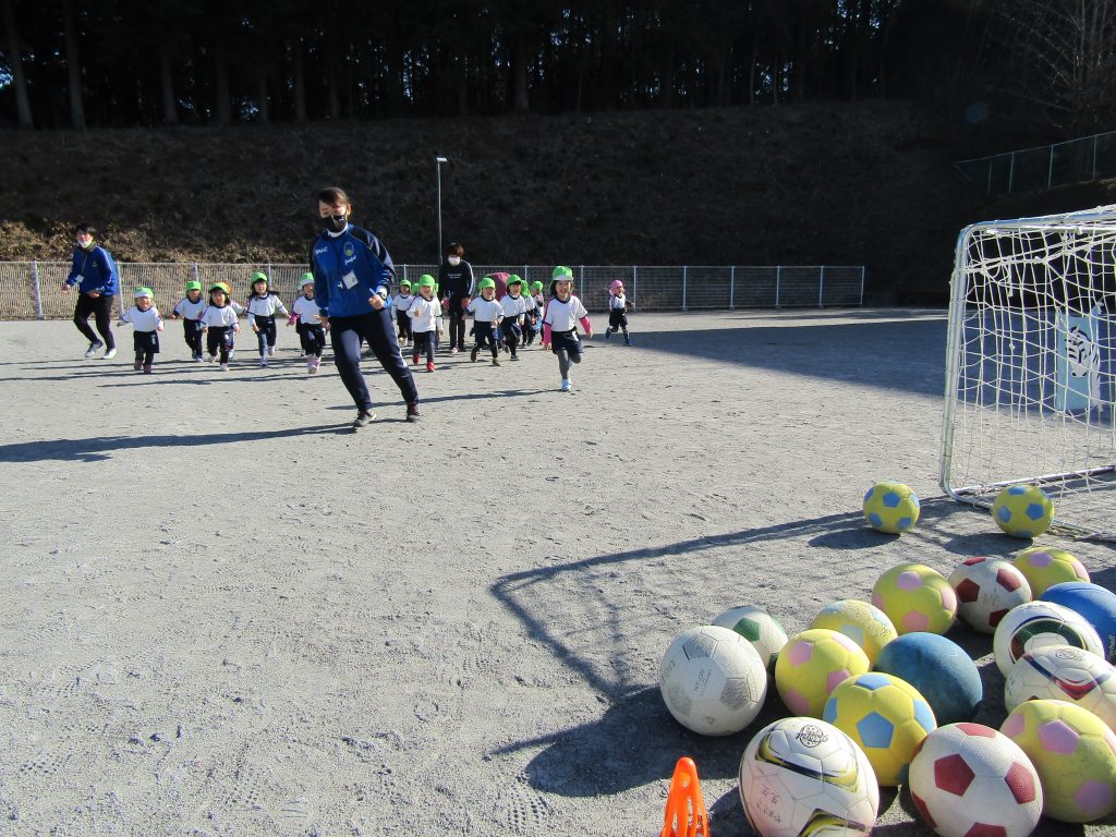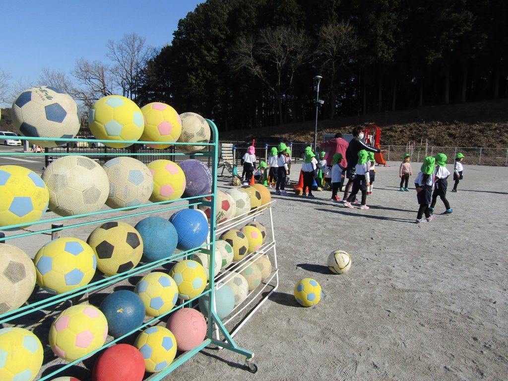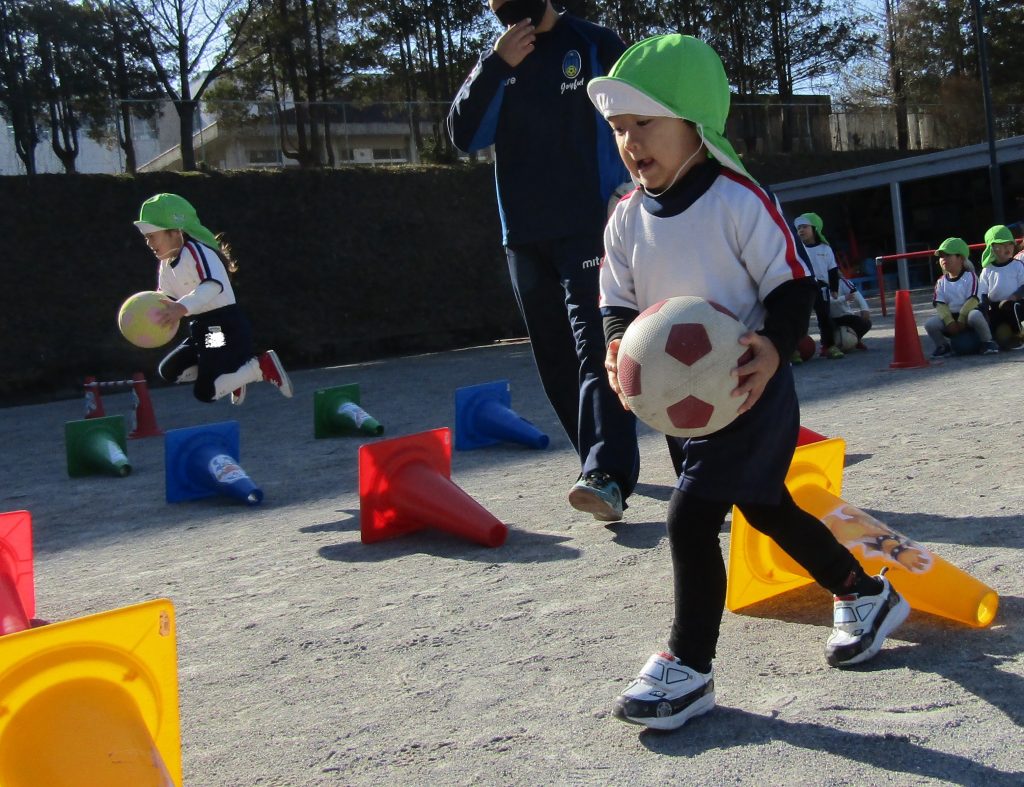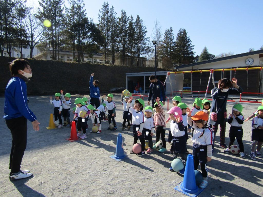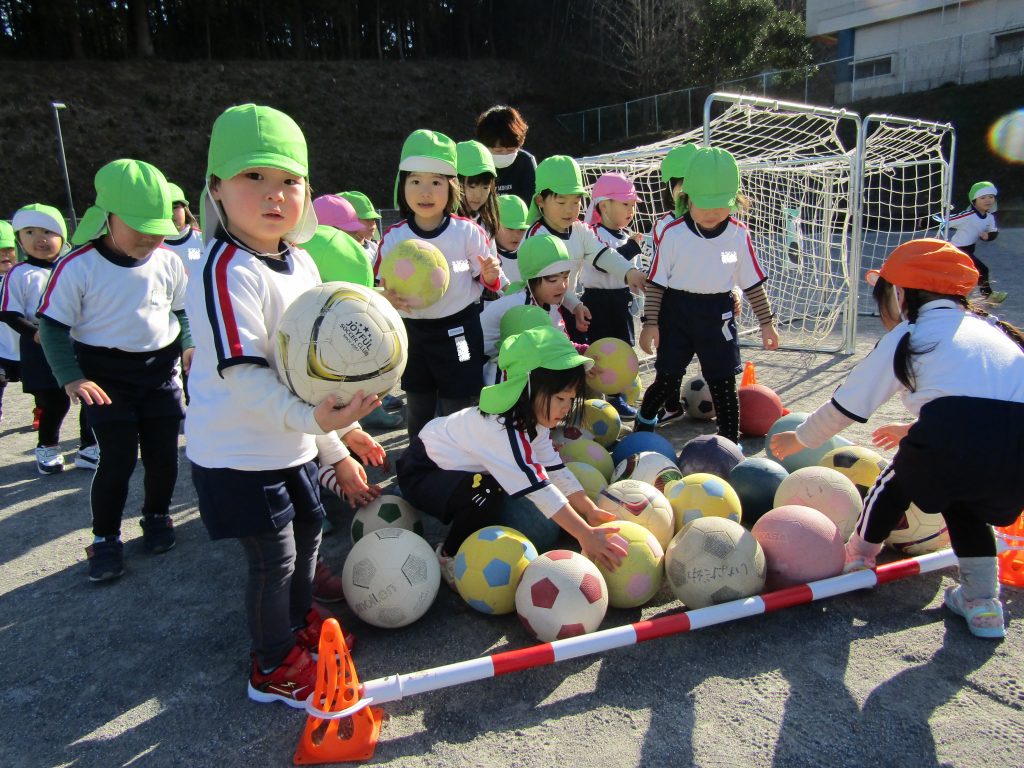 今日はよく晴れ、風もなくサッカーにぴったりの天気です。ぱんだ・こあら組さんが元気よく園庭に飛び出してきました。今から月2回のサッカー教室が始まります。みんな楽しみにしていたようで、検温・手洗い・消毒を済ませて、一斉にサッカーの先生のところへ集まりました。強い体を作るために、元気いっぱい頑張りましょう!