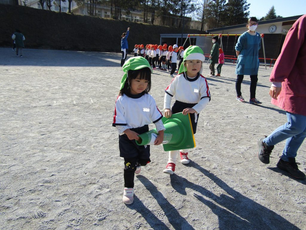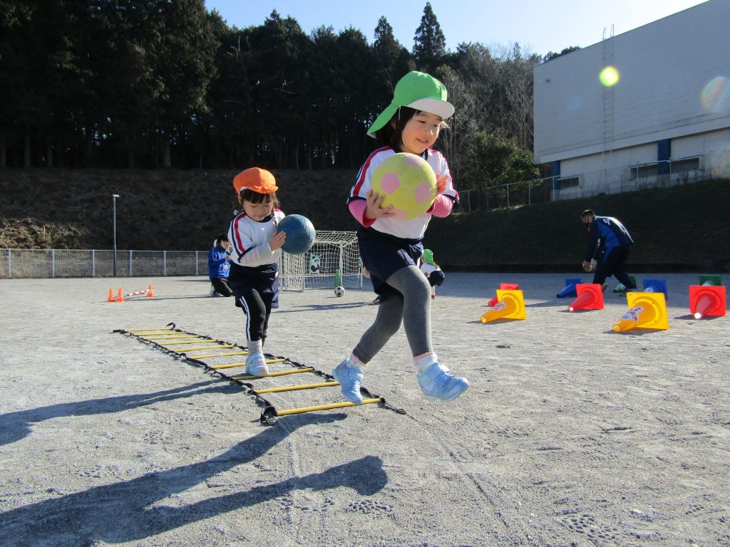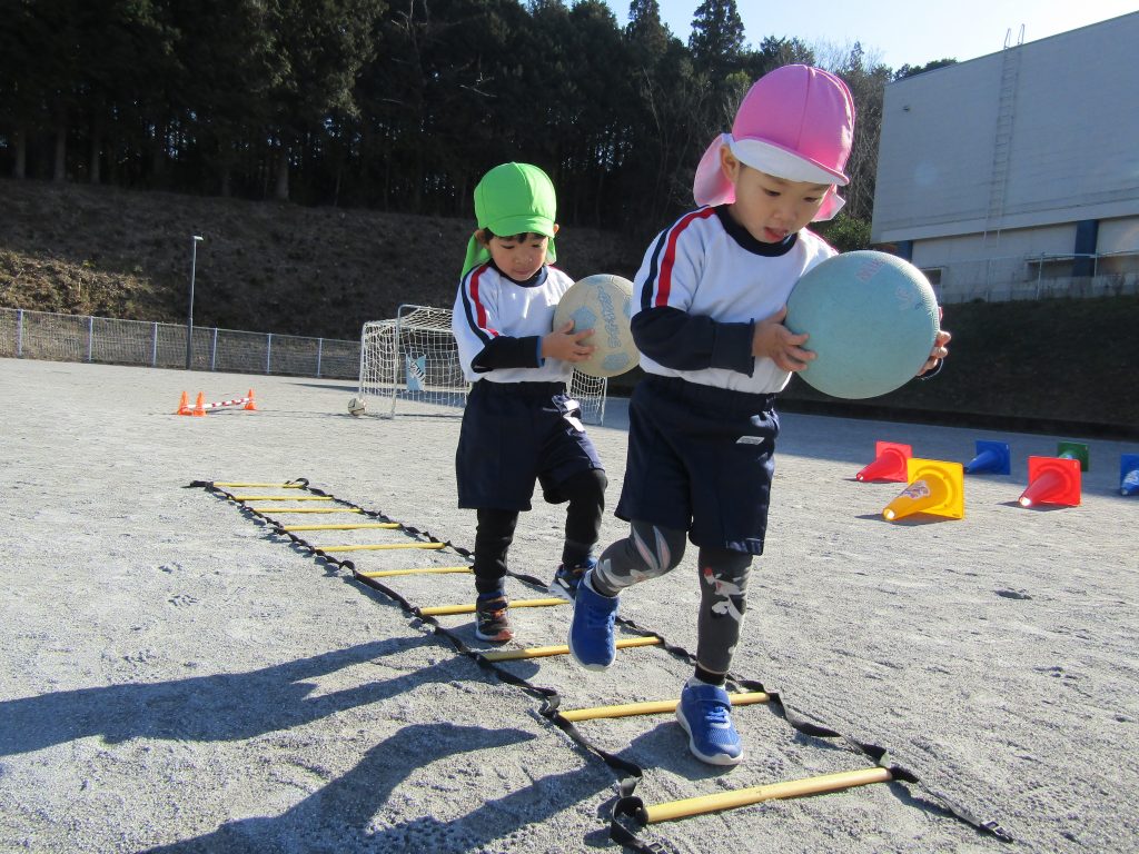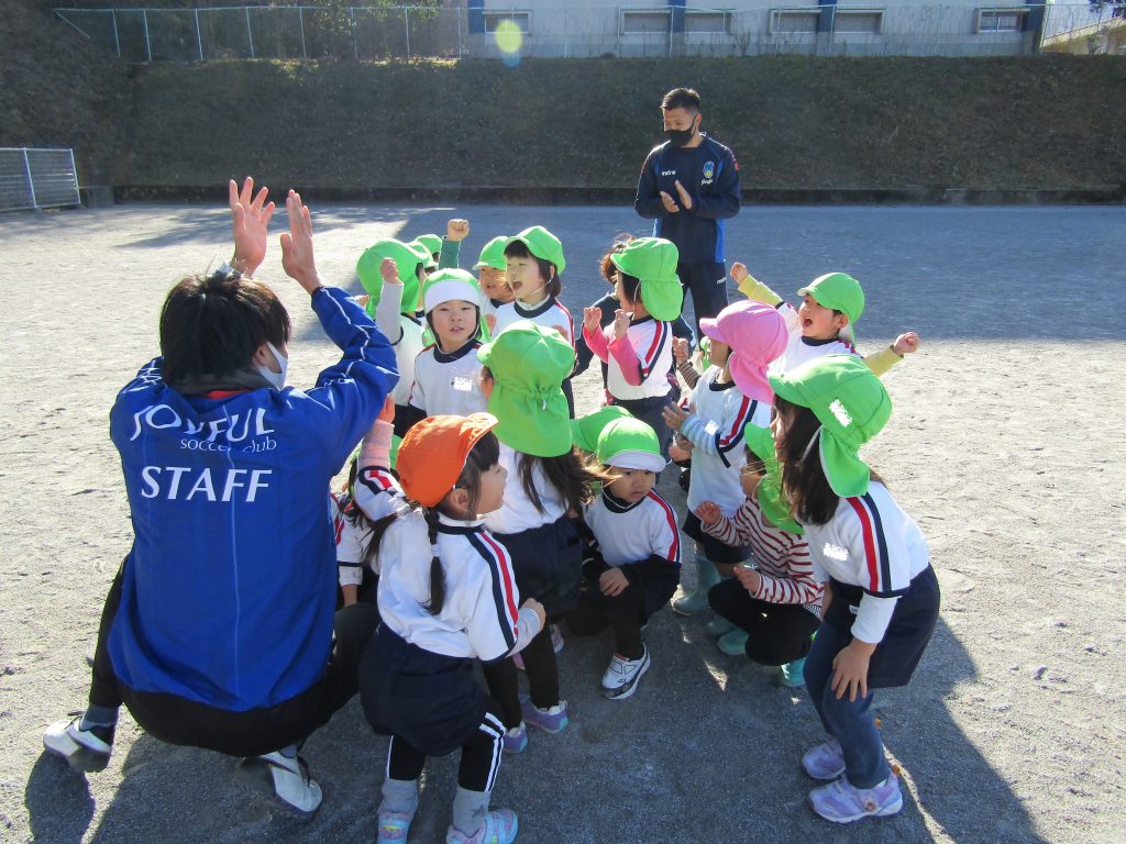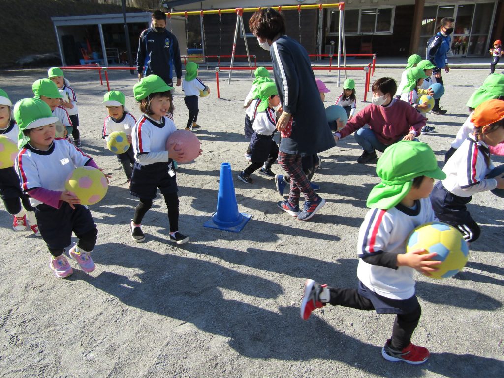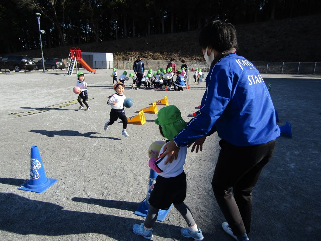 今日はよく晴れ、風もなくサッカーにぴったりの天気です。ぱんだ・こあら組さんが元気よく園庭に飛び出してきました。今から月2回のサッカー教室が始まります。みんな楽しみにしていたようで、検温・手洗い・消毒を済ませて、一斉にサッカーの先生のところへ集まりました。強い体を作るために、元気いっぱい頑張りましょう!