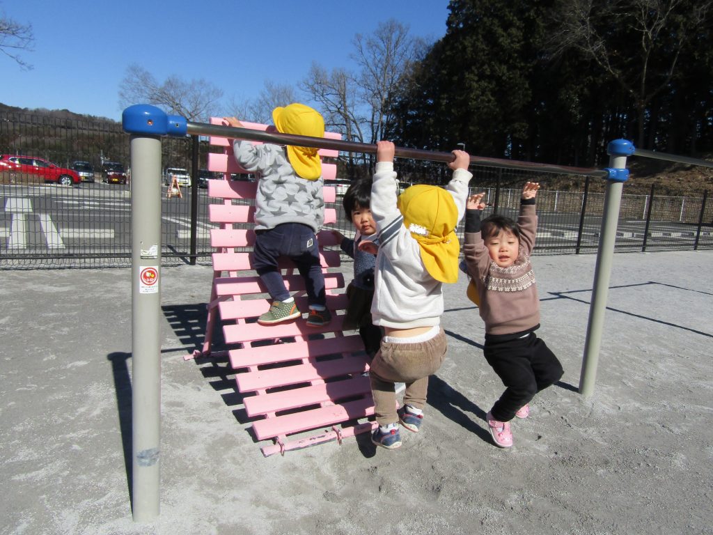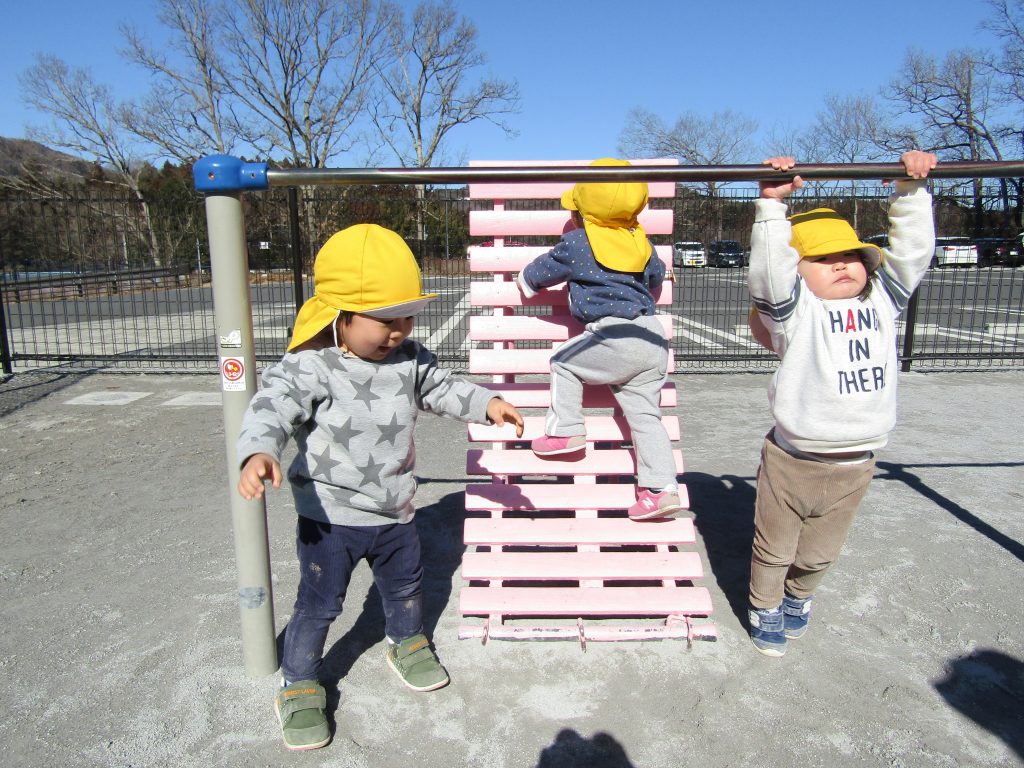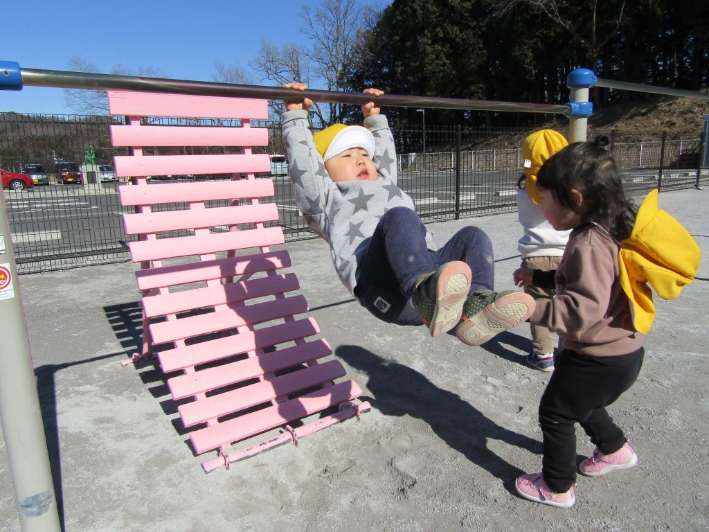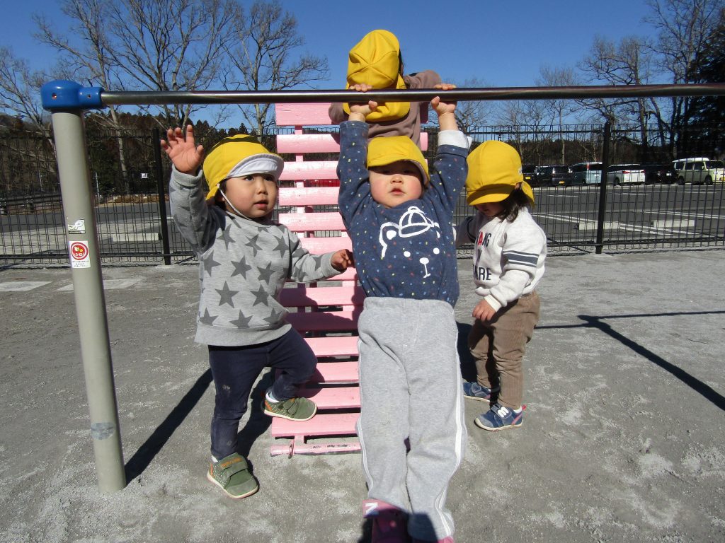 りす組さんは、朝の遊びでお兄さん・お姉さんたちが鉄棒の練習をしているのを、よく見ています。きっとみんな前まわりや逆上がりをすぐマスターできますね!その日が見られるのを先生たちは楽しみにしています。