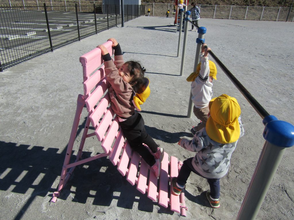 今日はとってもいいお天気。りす組さんが園庭にお散歩に出かけました。すると・・・鉄棒のところにあるピンクが目に入りました。りす組さんたちは、いち早く見つけ、一目散にかけ出して行きます。ピンクの正体は、逆上がり補助機!先日先生たちがペンキを塗ってピカピカにした補助機です。りす組さんどんな遊び方をするのかな?