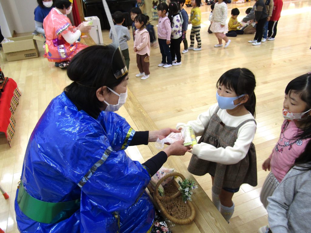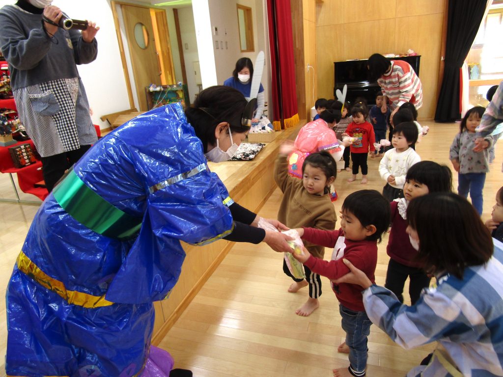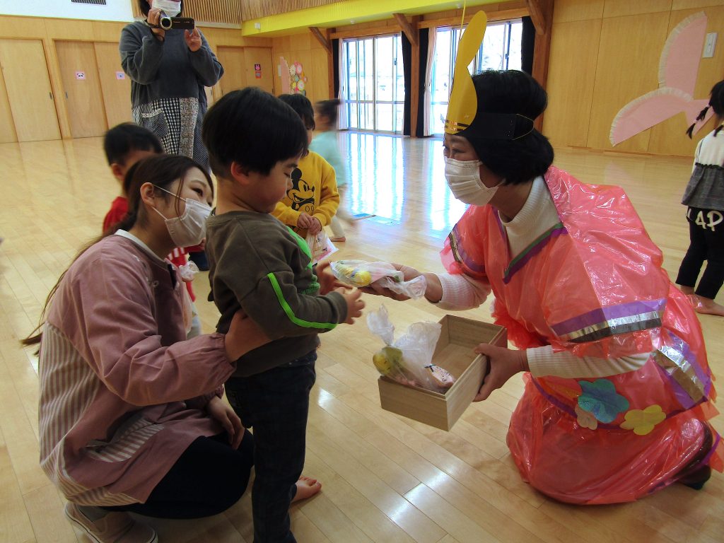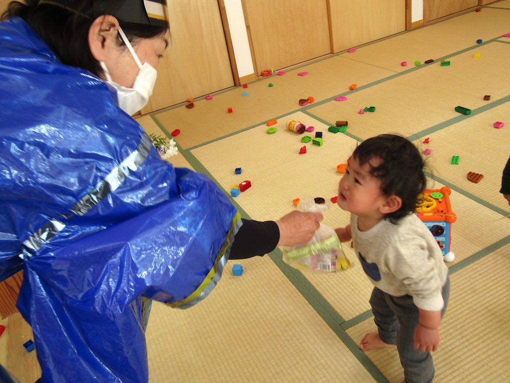 ひよこ組さんは泣いちゃいました。お菓子だよ!おててを出してごらん。