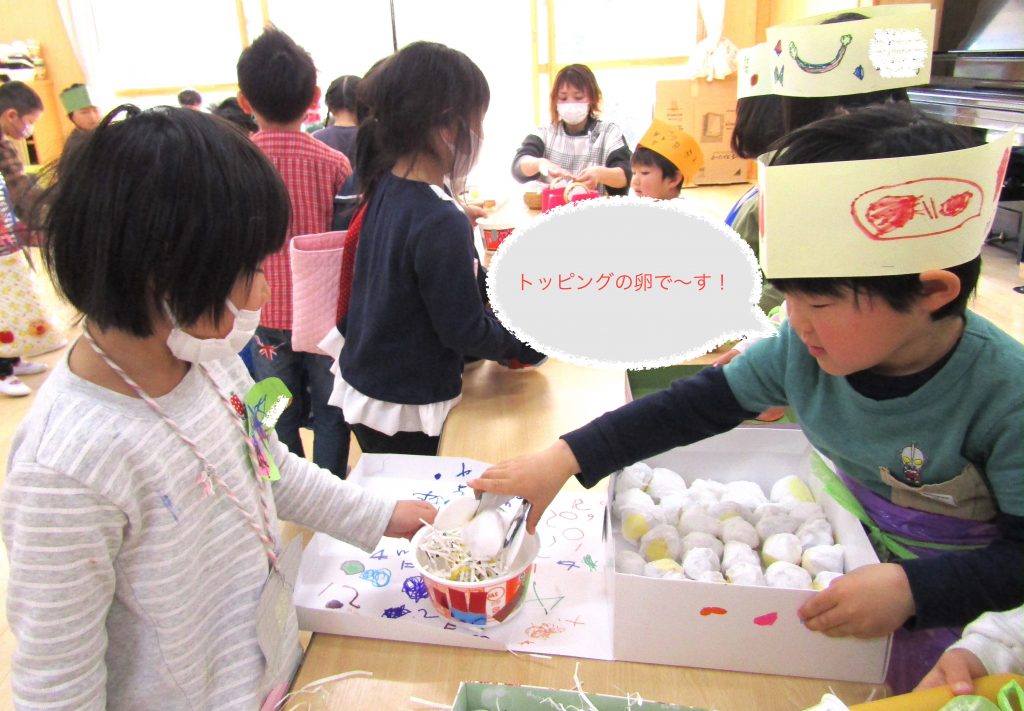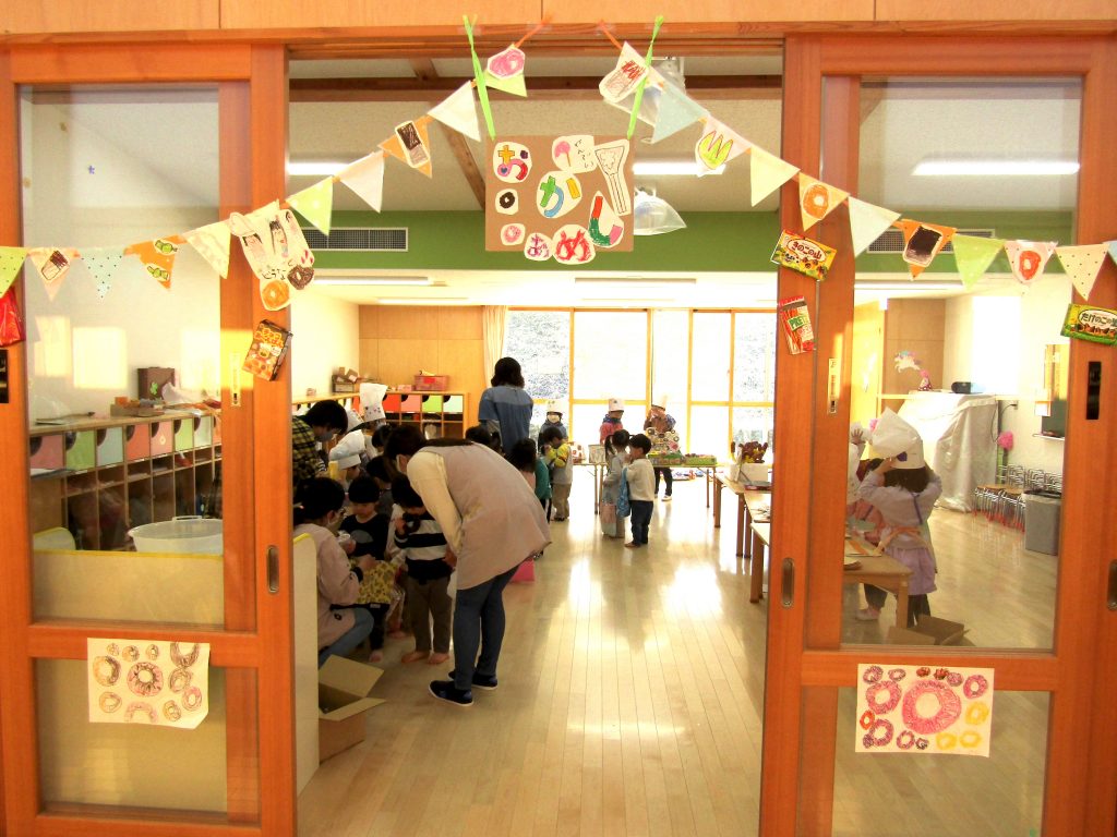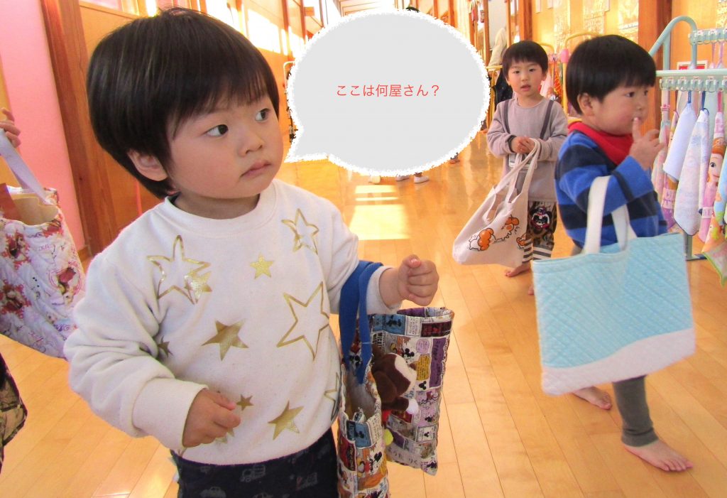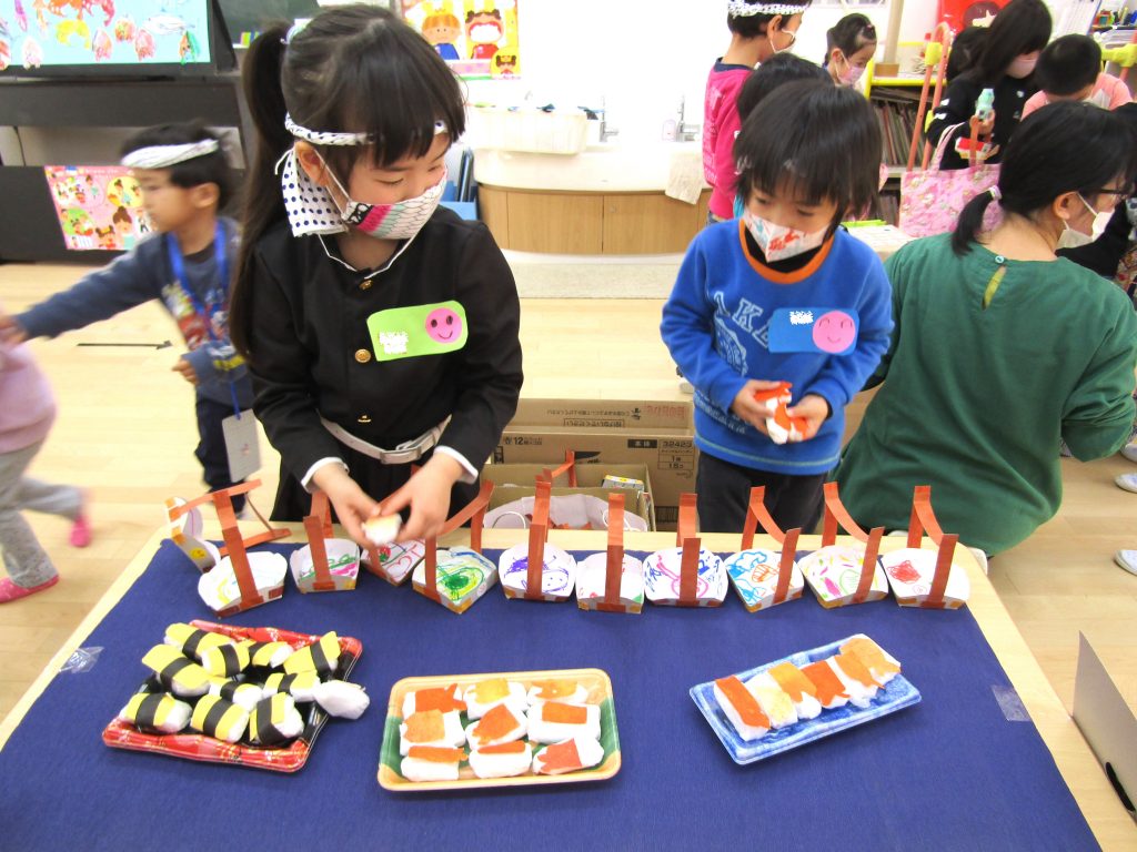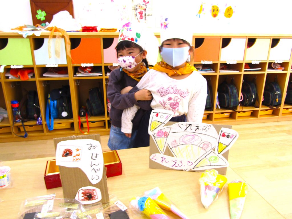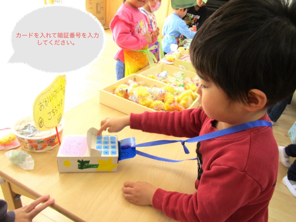 3、4、5歳児のお友だちは、保育の一環でたてわり保育を行っています。ぞう組さんを中心に子どもたちで話し合い、お店決めからスタートしました!お別れ会当日は、0、1、2歳児のお友だちもお買い物に来てくれてお店は大繁盛でした!