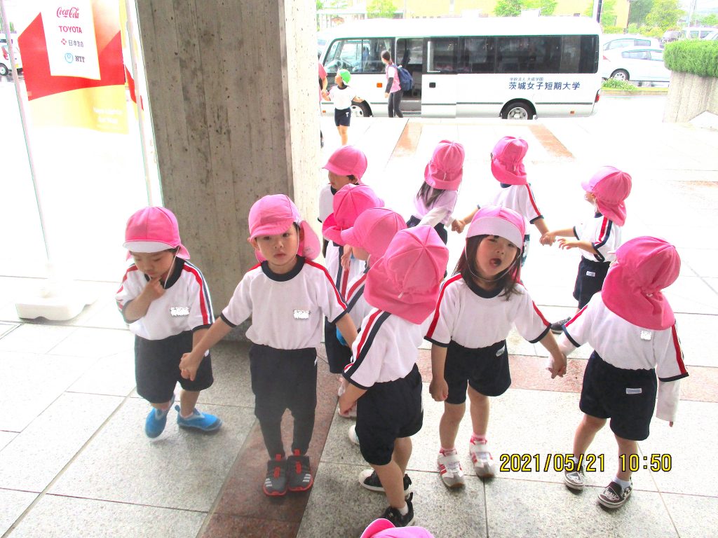 今日は、ずっと楽しみにしていた春の遠足です。お天気は雨ですが、茨城女子短期大学のバスも到着し、園児はソワソワしながら整列しています。リュックにお弁当と大好きなおやつを詰めて、いってきまーす!