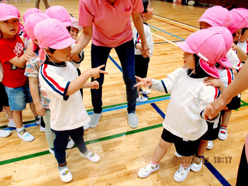 手をつないで全員がそろうまで待ちましょう!待ちきれずに後ろを向く3歳児さん。