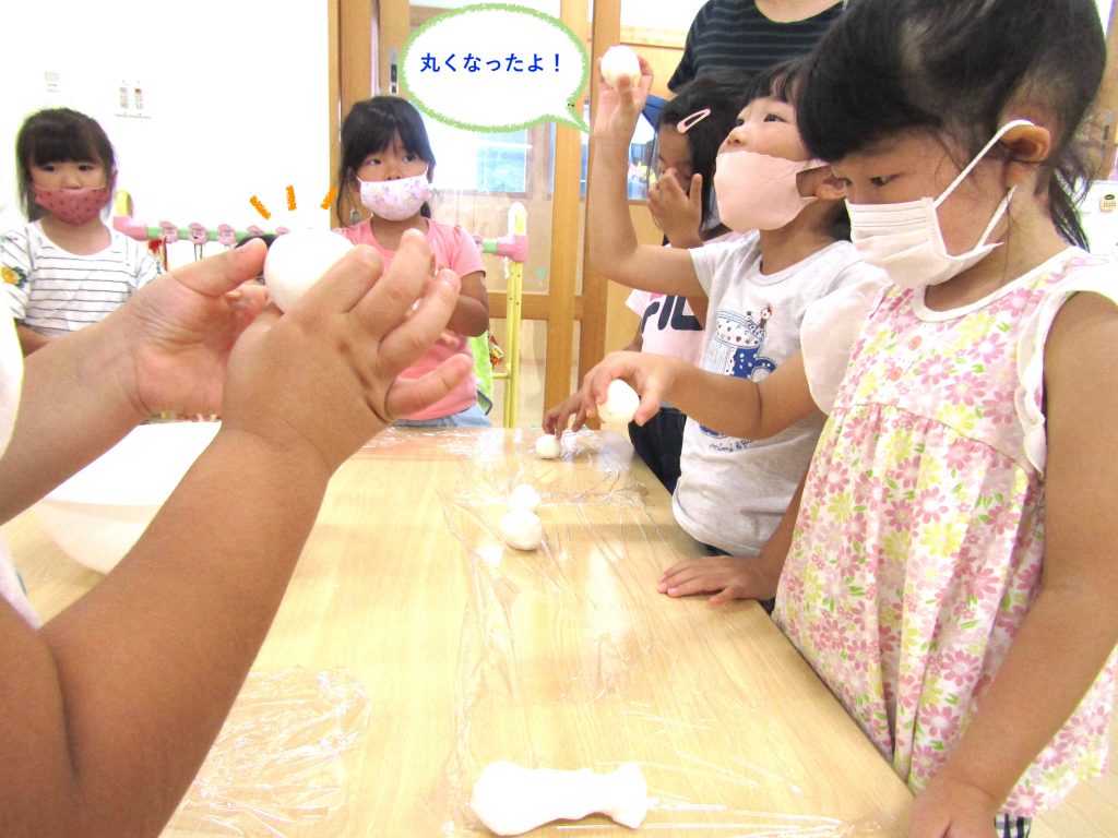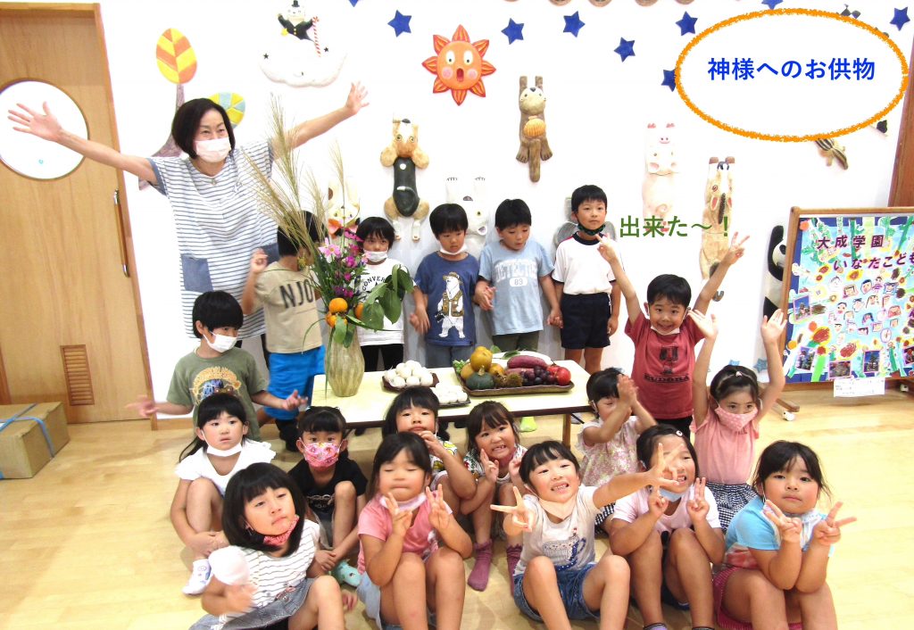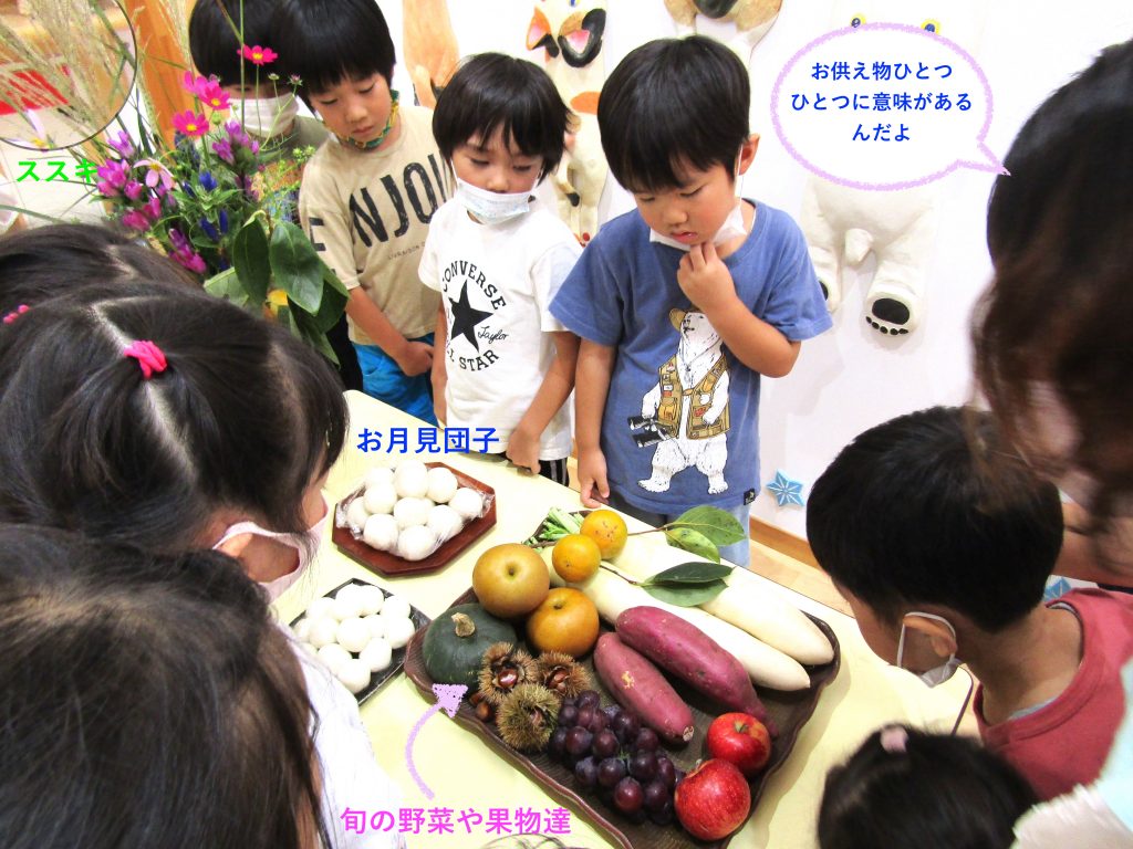 今日は、十五夜。。。一年の中で一番きれいなまん丸お月様が見える日です!「どうしてお供えをするの?」「お月見ってなあに?」それは、毎日おいしいものが食べられることに感謝すると共に、これからもおいしいものが食べられますように。。。という「願い」を込めて、神様にお供えをすることです。お月見には、お団子を食べて、元気でいられるようにお願いもします。「神様もどうぞお食べになってくださいね」みんなの感謝と願いが込められたお団子を神様はおいしく食べてくれたかな?(^O^)