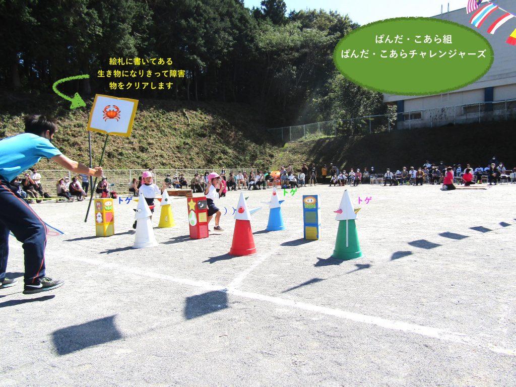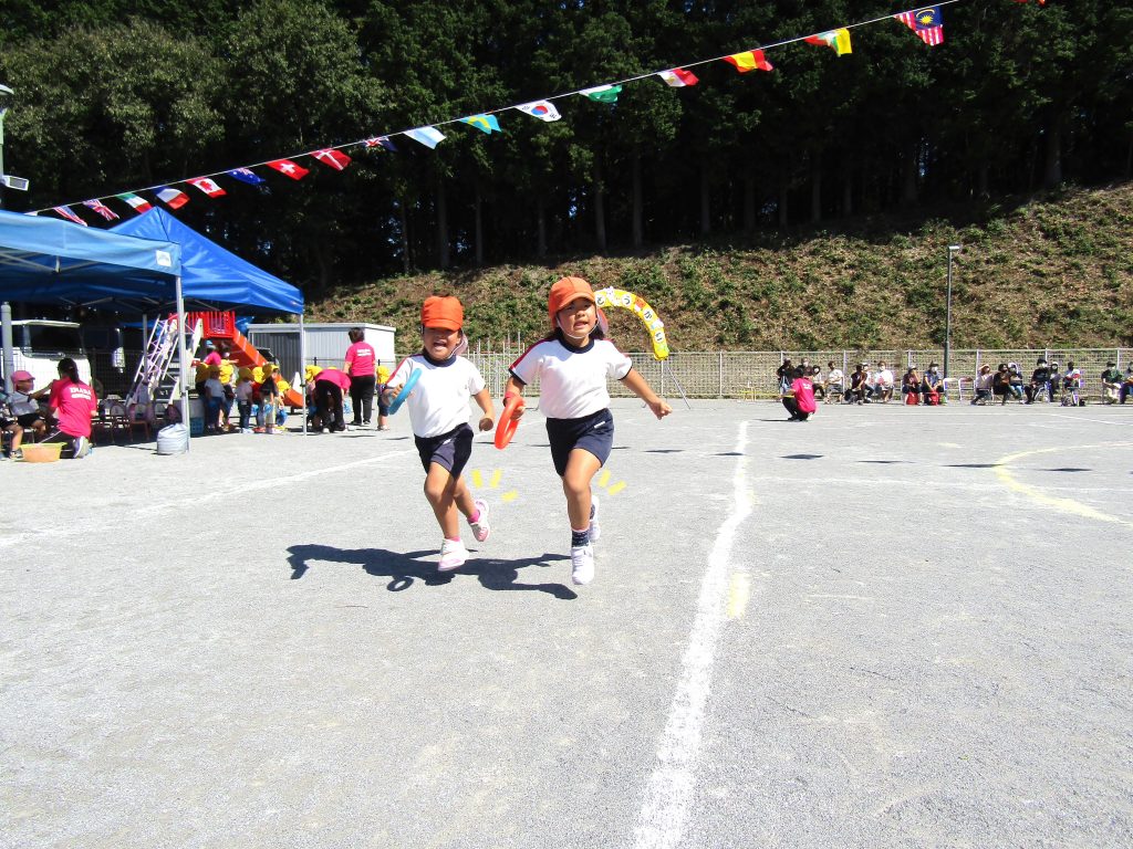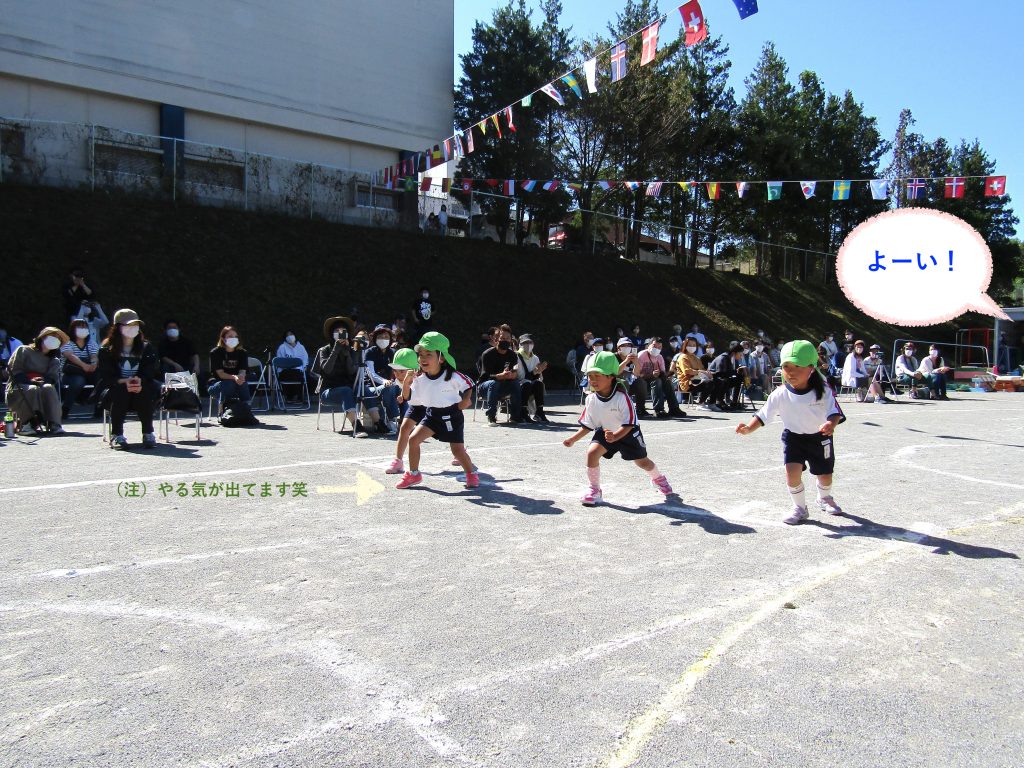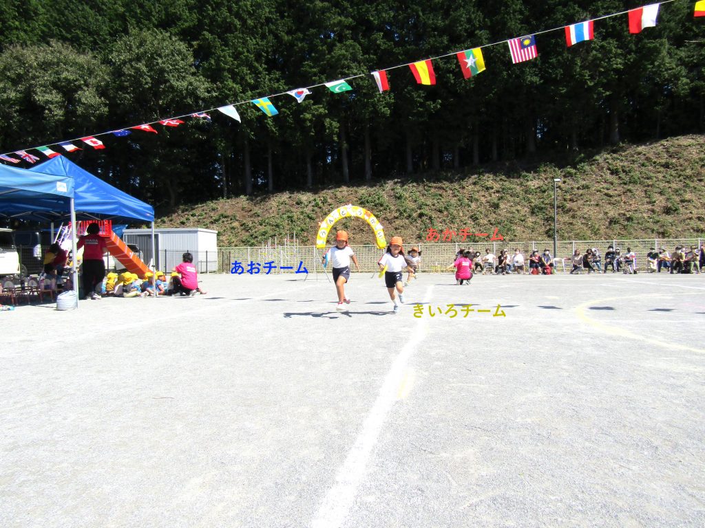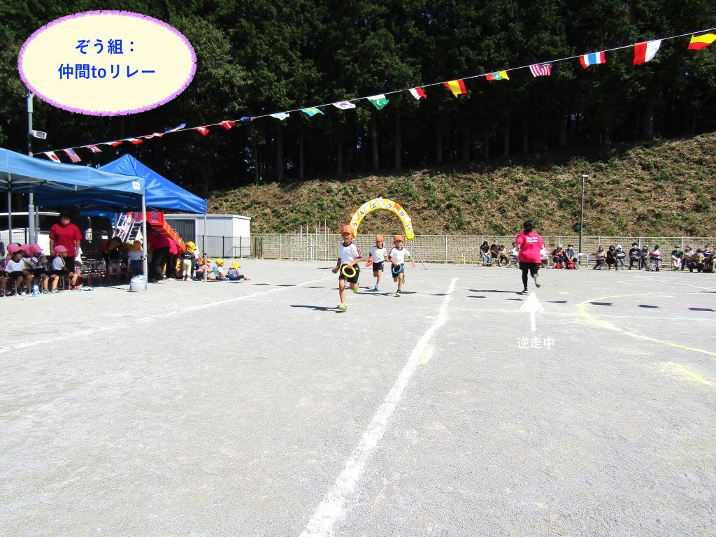 ぞう組最後の種目!仲間toリレーです!赤・青・黄3チームで競い、周りからはとても熱い応援が聞こえてきました!みんな真剣だけど楽しそうな表情です♪