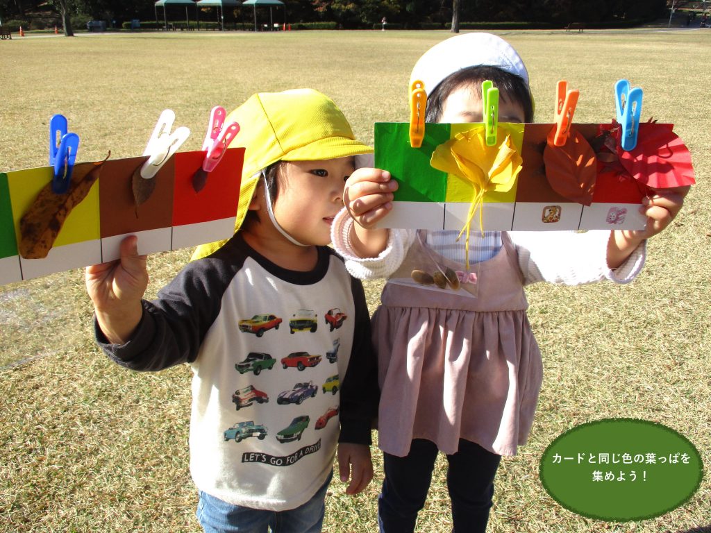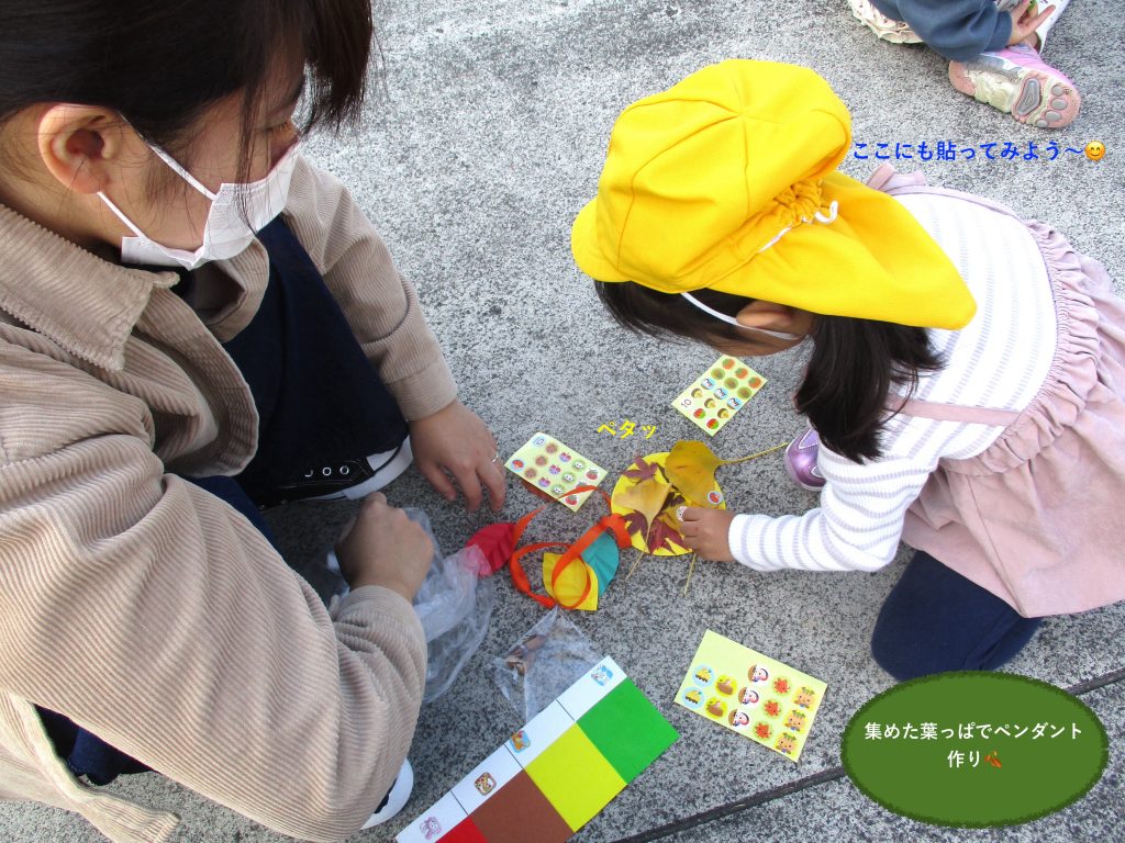 うさぎ組さんは、カードと同じ色の葉っぱを集めてペンダント作り☺️