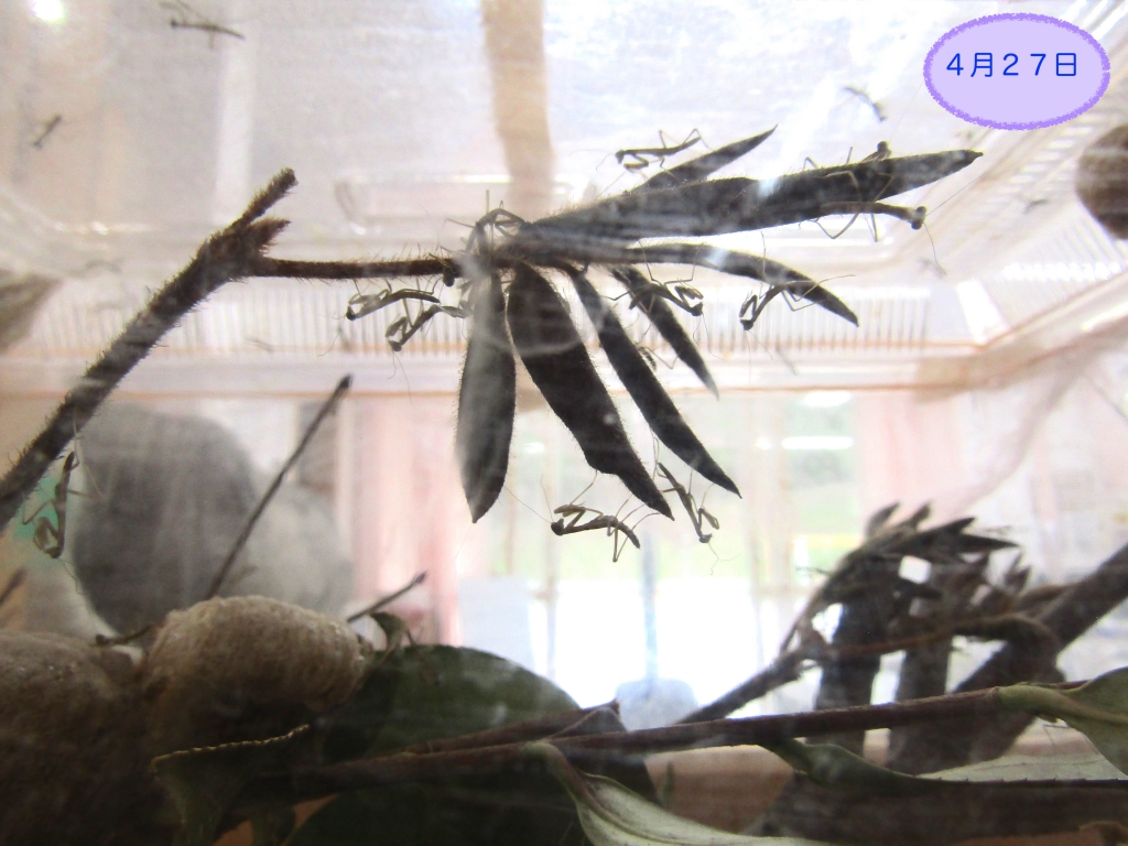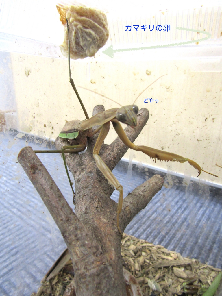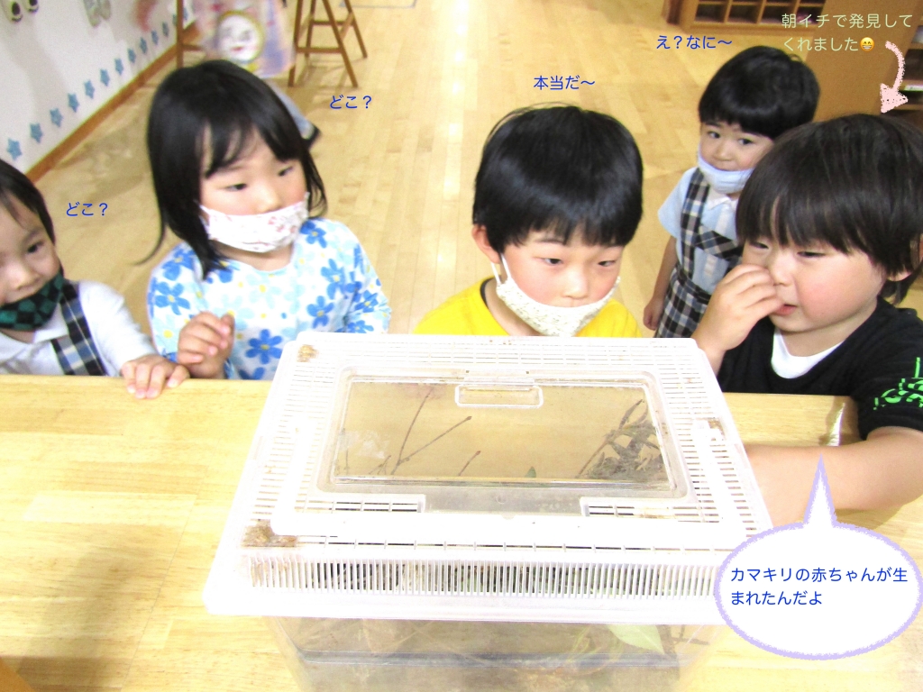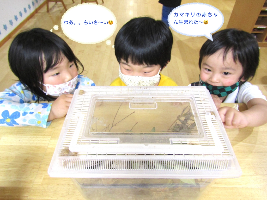 昨年の10月にカマキリが卵を産みました♪玄関前のカウンターに置いてある虫かごを毎日のぞきにきていた子どもたち😀「今日もまだだね。。。」「早く生まれてこないかな。。」と楽しみにしていました😁カマキリの赤ちゃんが生まれているのを発見すると「見てみて!赤ちゃん!」「生まれたよ!!」と大興奮でした♬カマキリの赤ちゃんはこの後、自然に返してあげます☺️大きくなってまたみんなのところに遊びにきてね♪