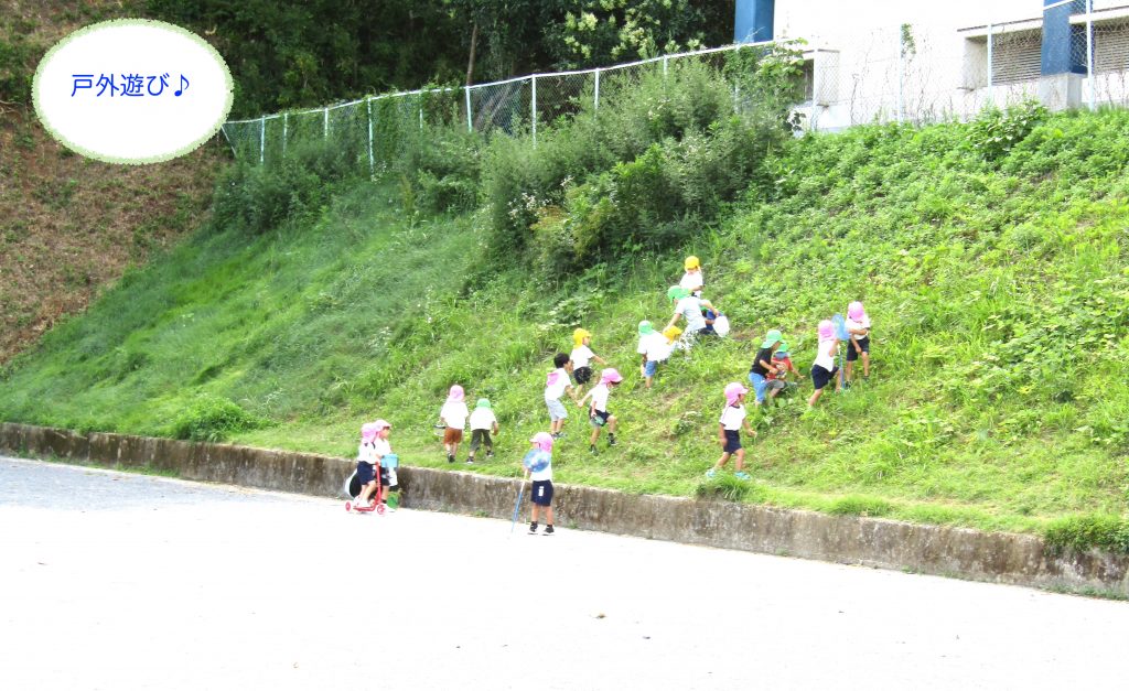 こども園の周りには、自然がいっぱい!いなだこども園では、毎日朝・夕と戸外遊びを行っています😀子どもたちが戸外に出て真っ先に向かうのは…なんと!園庭の横の土手!!ここは虫の宝庫✨子どもたちに大人気な場所です😆春には、ヨモギや山菜探し✨夏には虫探し✨いなだこども園の土手は、年中無休です♪