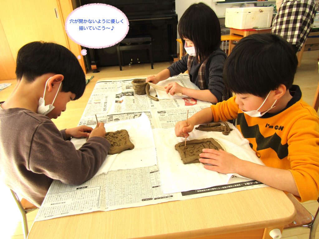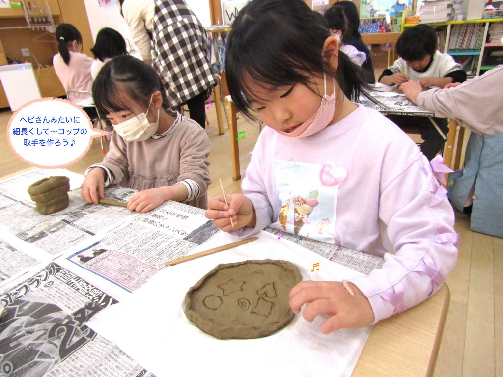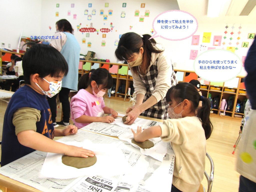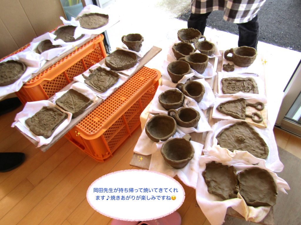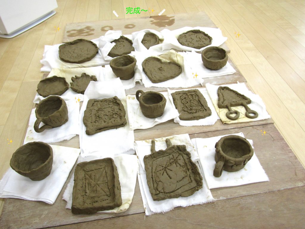 「陶芸教室では何を作ろうかな〜?」コップ、お皿、お茶わん、みんなこの日を楽しみにしていました♪奥田先生が用意してくれた丸い形の粘土を作るものによって切ったり平らに伸ばしたり…分からない時には、奥田先生が優しく丁寧に教えてくれました♪「ハートの形にしよう💖」「お皿に絵を描きた〜い♪」みんなそれぞれ考えた形や模様に仕上げていきました☺️焼きあがりが楽しみですね♪