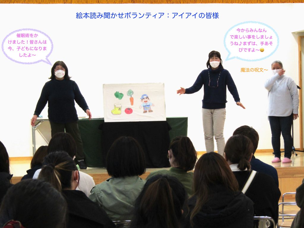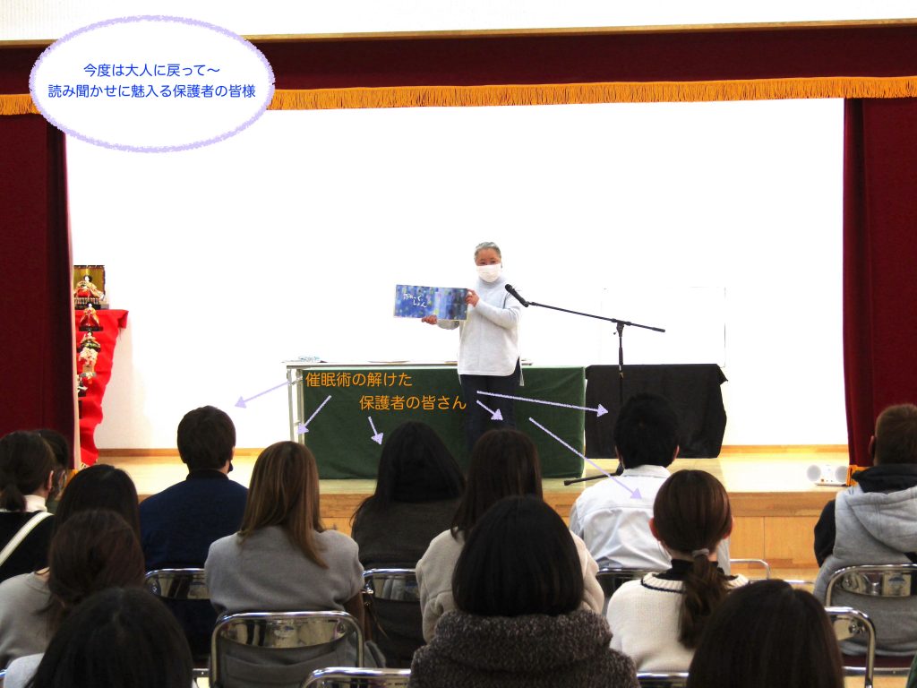 『アイアイ』さんに催眠術を解いでもらい保護者の皆さん大人に戻りましたよ〜😁皆さん今度は静かに読み聞かせに魅入っていました♪