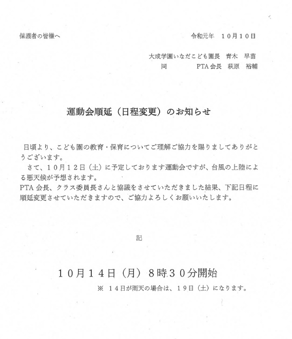 今年度10月12日(土)に開催予定の大成学園いなだこども園第1回運動会ですが、大型台風の接近により、天候の悪化が予想されますので、下記の通り、10月14日(月・祝)に延期させていただきます。