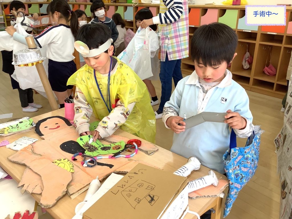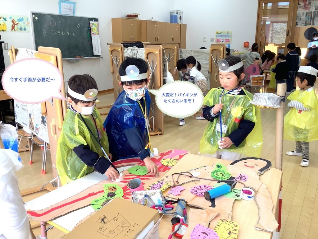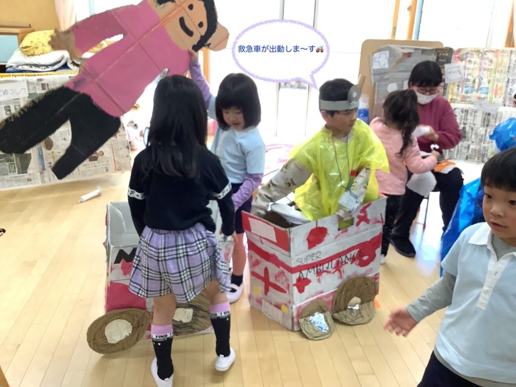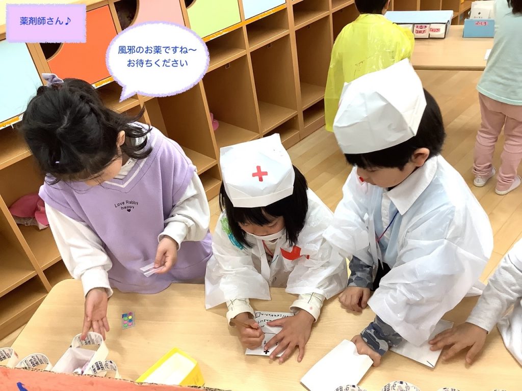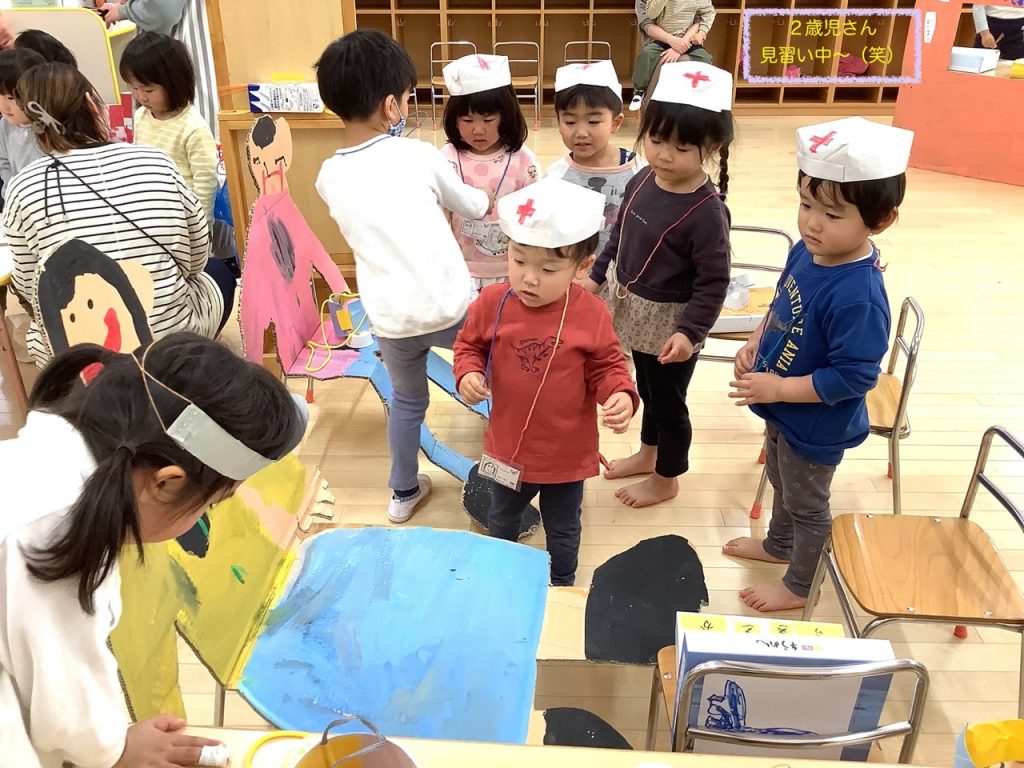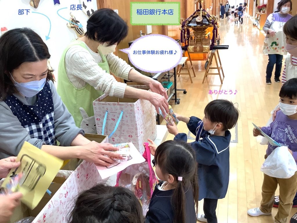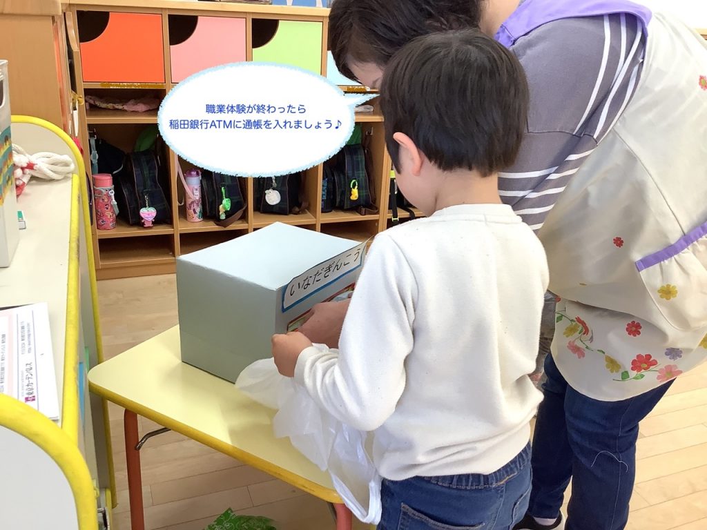たてわり保育のまとめイナッザニアは、3歳〜5歳のお友だちで3つのグループを作り、1年間のたてわり保育の中でこどもたちが話し合い考え作り上げてきたものです♪今年は、職業体験『忍者村』『いなはっと(ピザ屋)』『いなだこども病院』を行いました😁今年は、保護者の方の希望があったため、たてわり保育イナッザニアを自由参観としました♪たくさんの保護者の方に参観いただきました😀子どもたちが普段通りに思い切り楽しんでいる様子がご覧いただけたかと思います♬1つの職業体験を終えるごとに『いなだ銀行ATM』へ行き通帳に記帳するという手の込みよう♪体験を終えた子どもたちは、通帳を手に『いなだ銀行本店』へGo〜♬ごほうびをGETしました😆