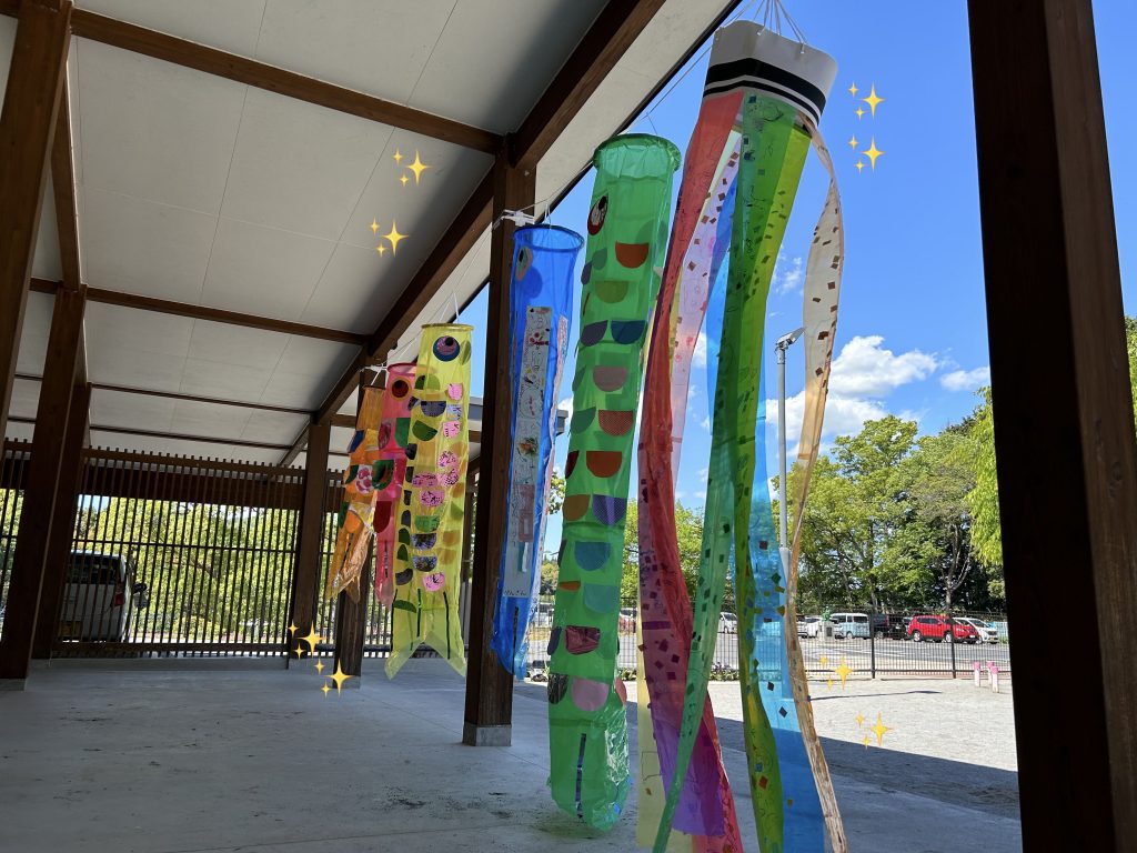 いなだこども園では毎年、子どもたちの手作りこいのぼりが大空を泳ぎます。登園、降園時や・園庭で遊ぶ時には、上を見上げて笑顔になる子どもたちの姿があります。さて、明日はこどもまつり。こいのぼりのように大きく元気に育つよう、めいっぱい楽しむ1日が待ってます。その様子はまたのお楽しみ・・・。