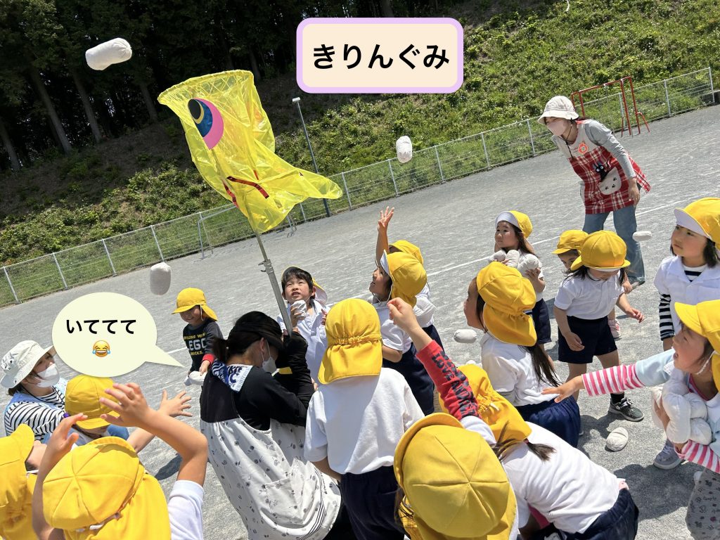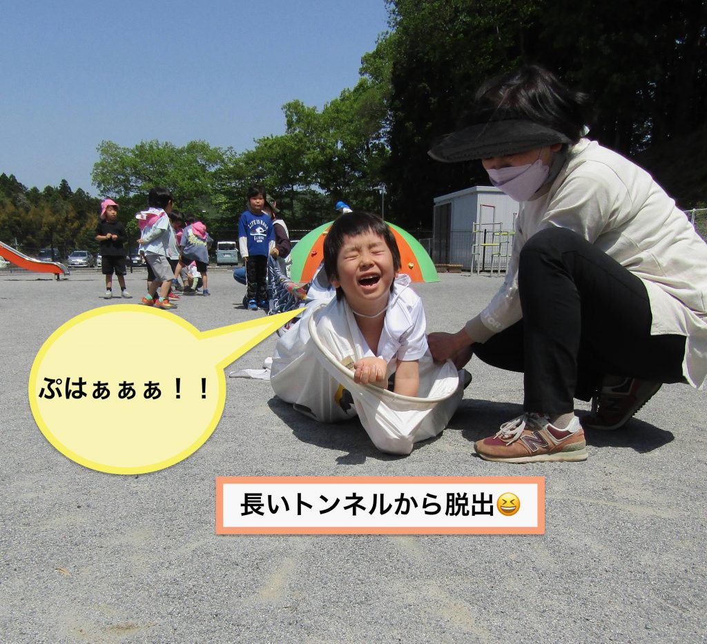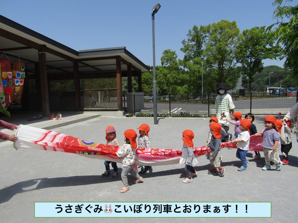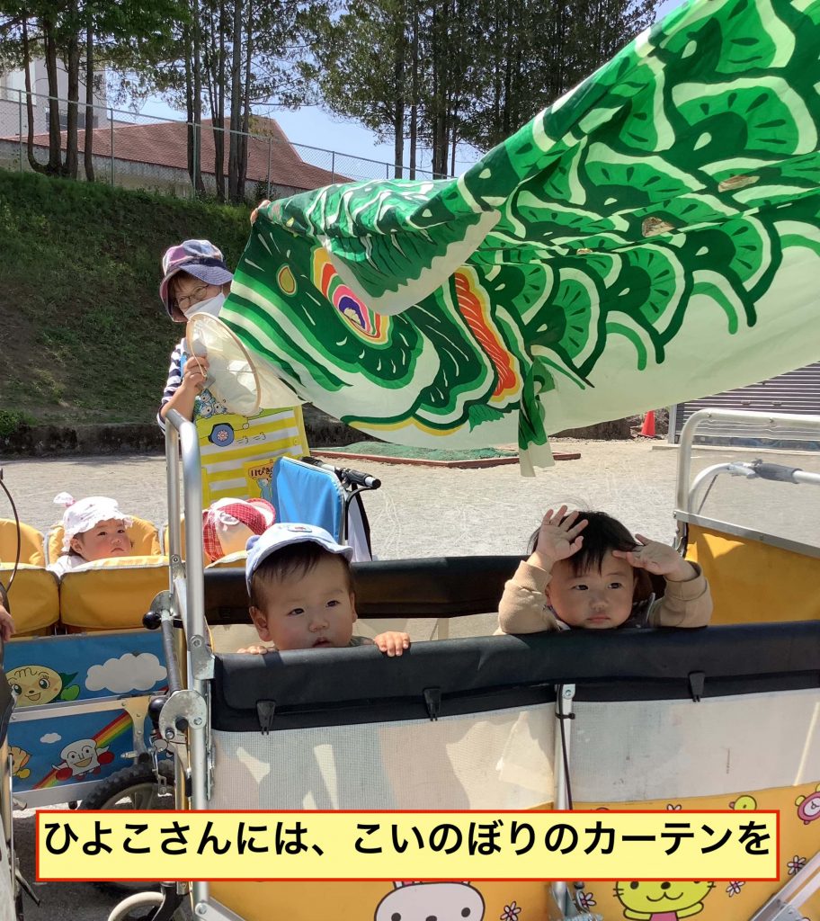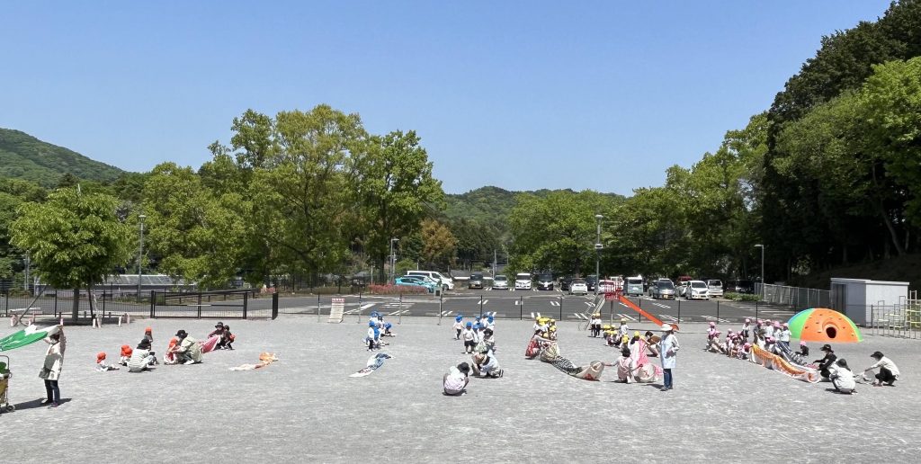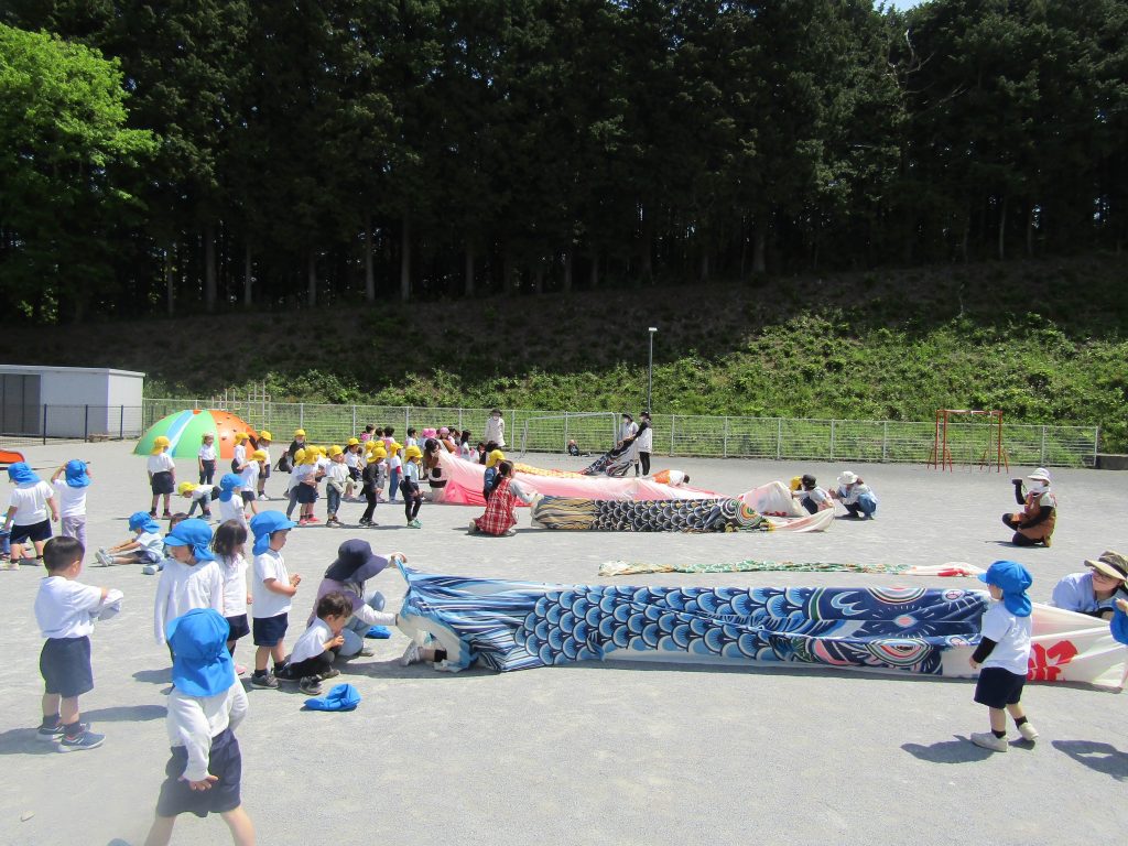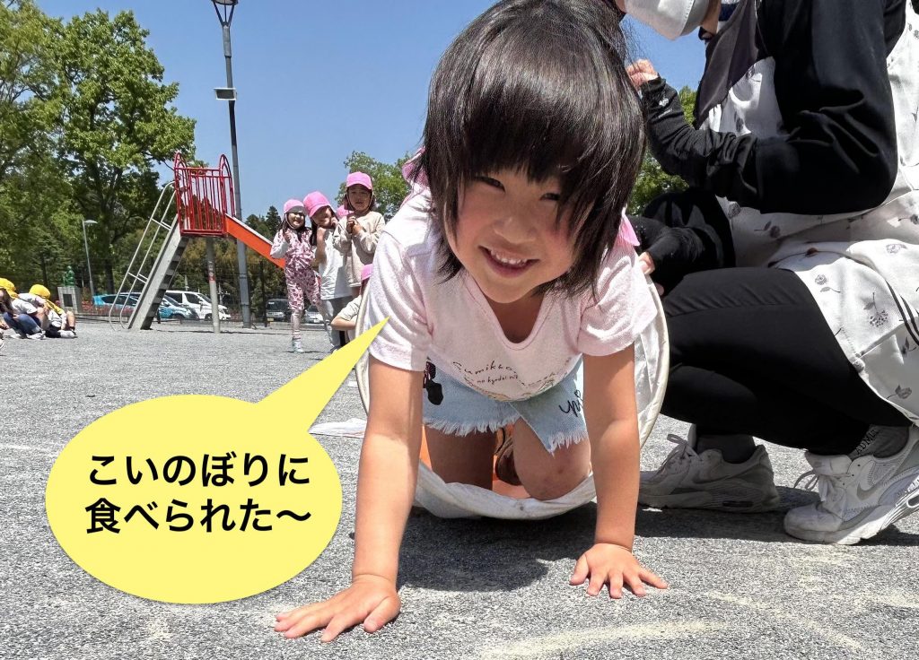 園庭でのびのび泳ぐこいのぼり🎏その数10匹以上!!こども園伝統行事「こいのぼりくぐり」が始まりました。しっぽから入ってお口から出てきます。