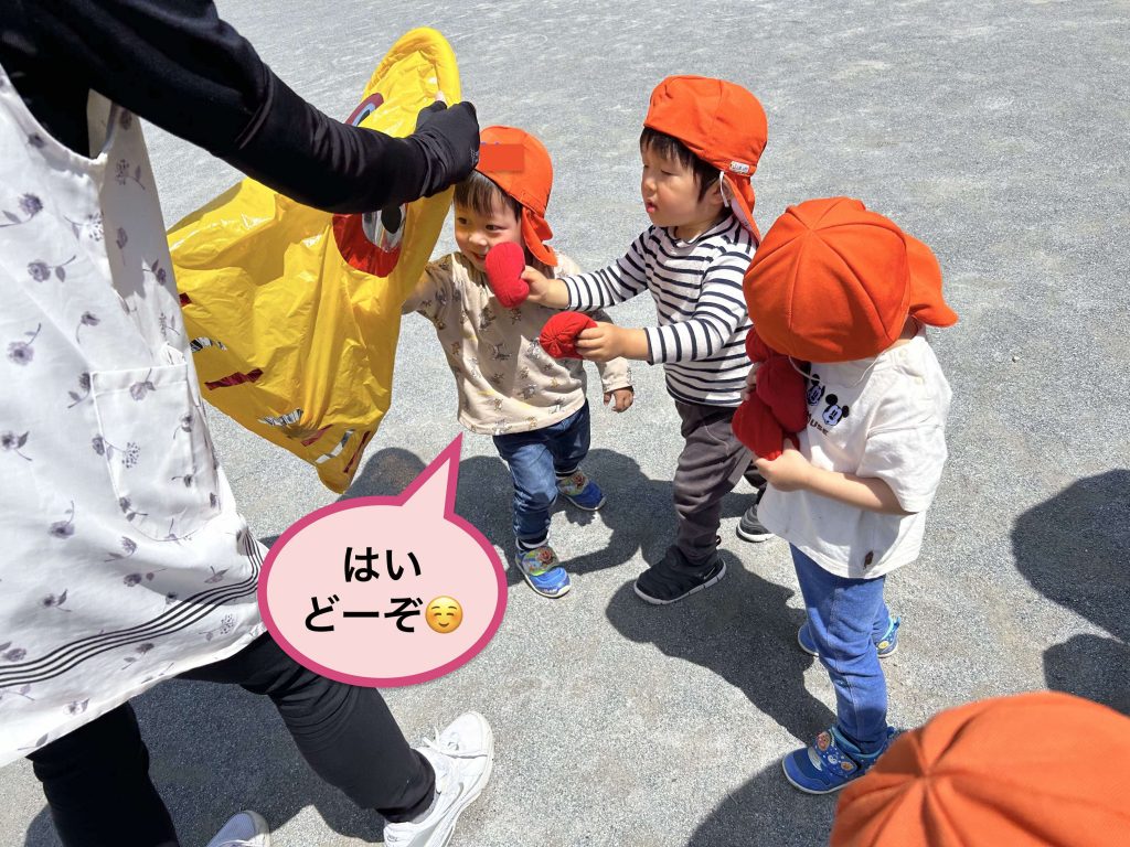 「はいどうぞ」と1つずつあげる子、たくさん集めてニコニコの子・・・。ほんわか未満児さん♡