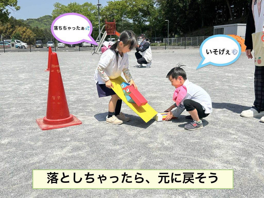 5歳児はこいのぼりの箱を3つ積んで、コーンを回って帰ってきます。落としたらやり直してまたスタートです。