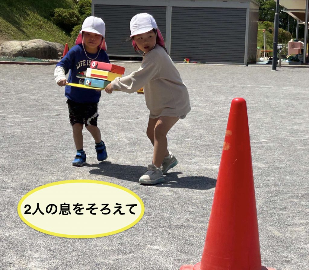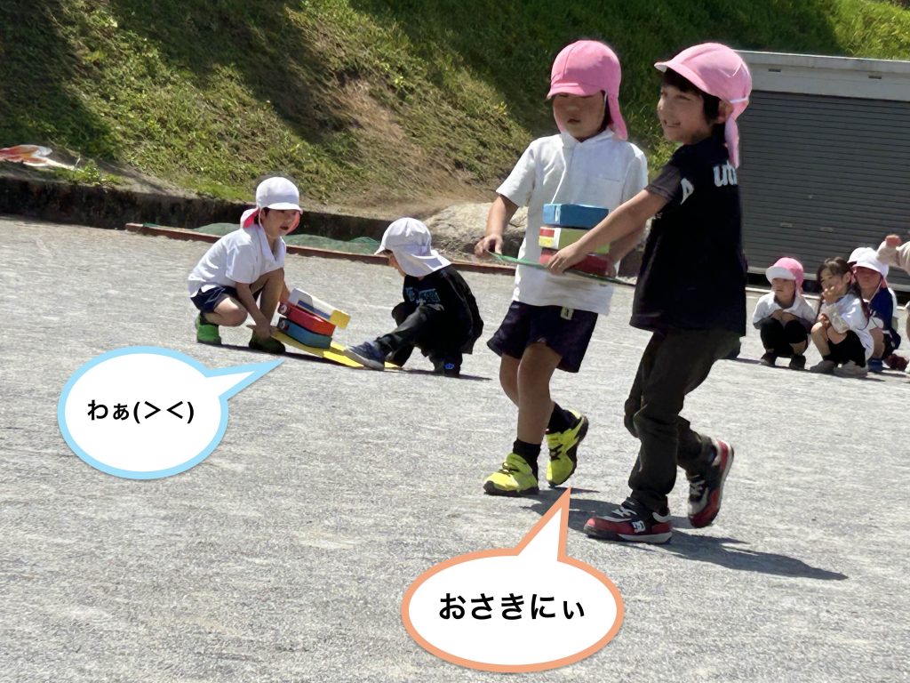 年長さんは頭脳戦です!!どうしたら崩れないか、お互いの息を合わせて考えて進みます。かっこいいぞう組さん♡ごほうび