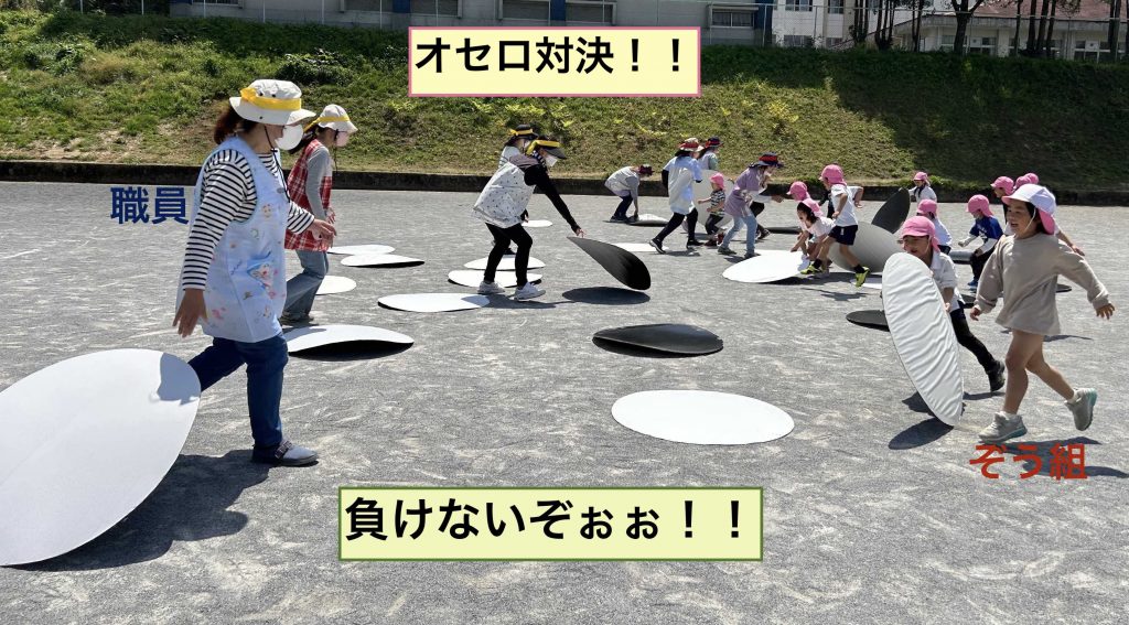 巨大オセロが登場し、年長児と職員の対決が始まりました。サプライズ演出に会場は大盛り上がり!!どちらも負けじと必死にオセロをひっくり返します(о´∀`о)