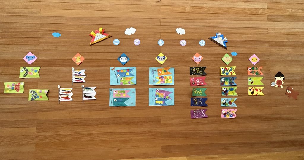 こども園のギャラリーに、各クラスで作ったこいのぼりが飾られました。今日はこどもまつり。いなだこども園では、子どもたちの元気な声と満面の笑みでにぎわっています。