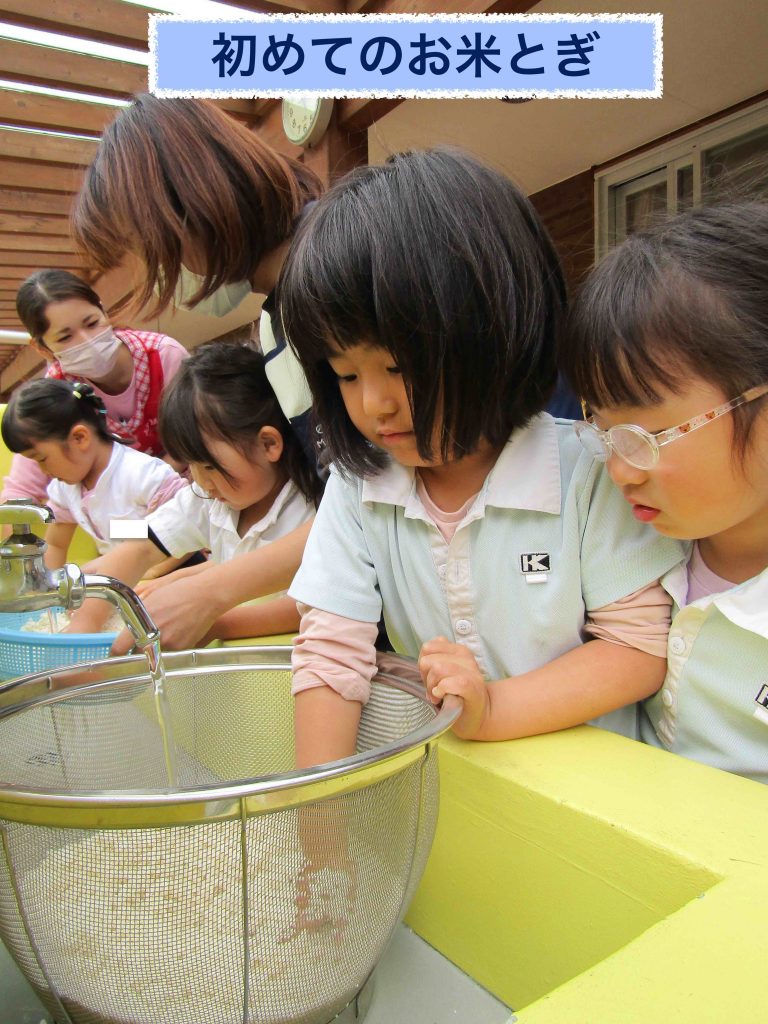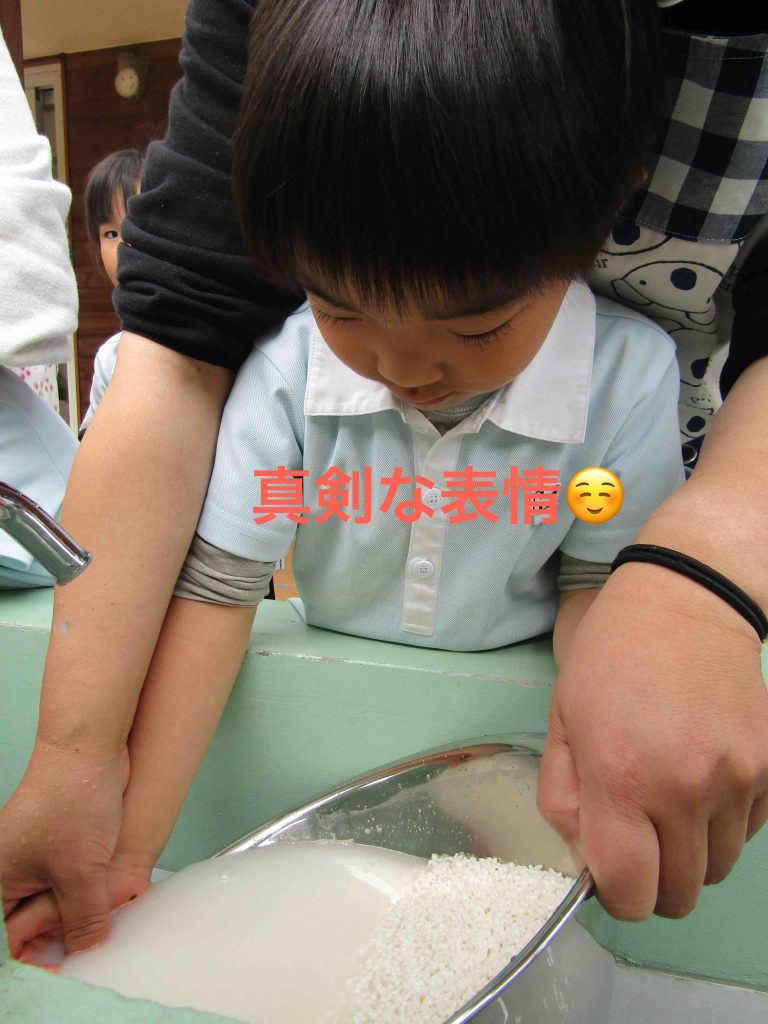 まずは、お米を研ぎましょう。きりん組さんは初挑戦です!!合言葉は『回してぎゅっ』とぎ汁が澄んできたらオッケーです🙆