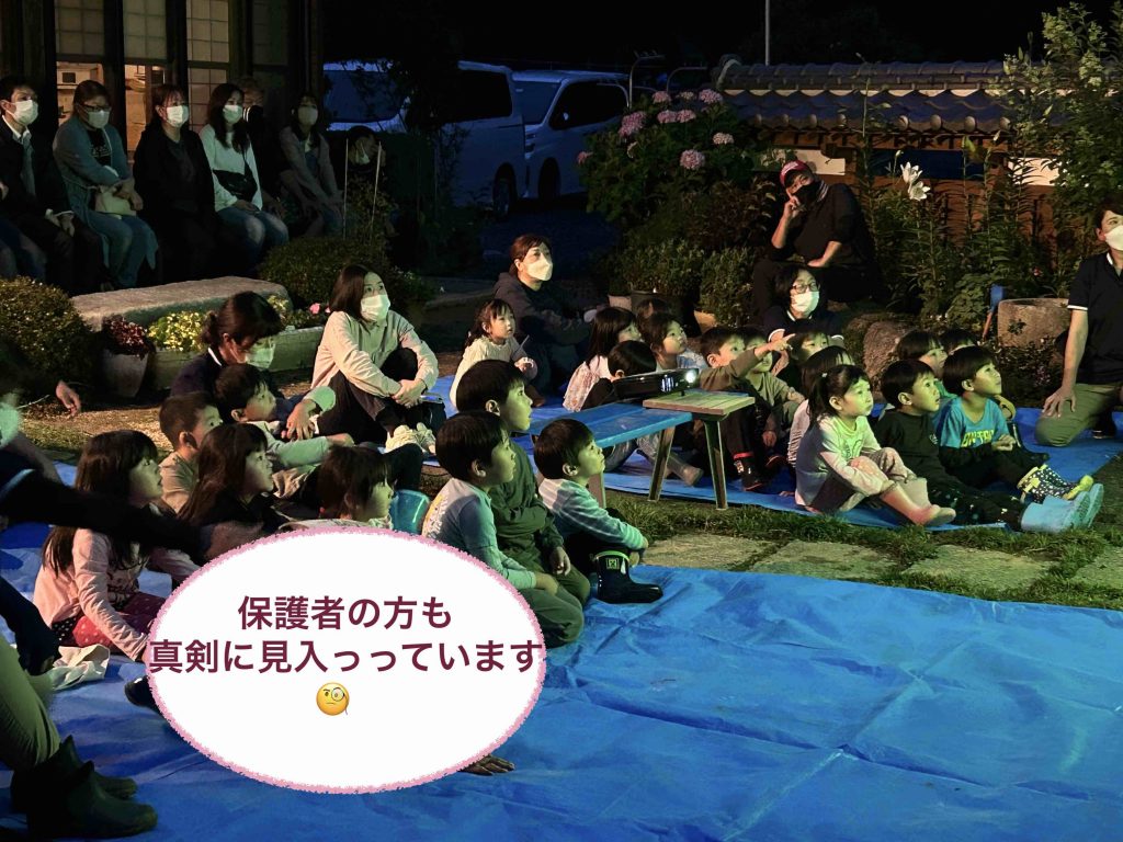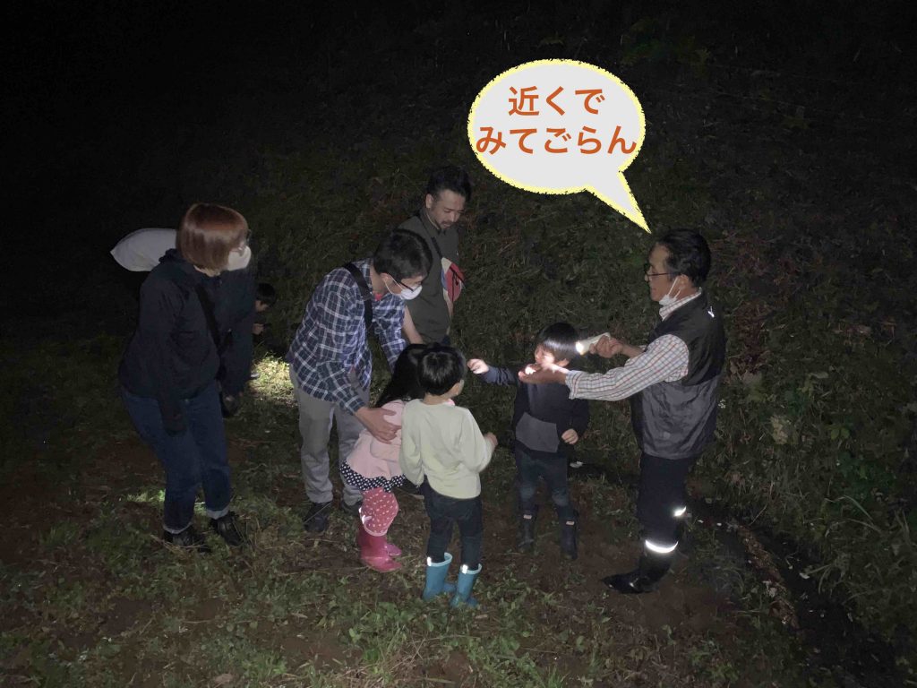 山の方からポワンと光がチラチラ。『ホタルだぁ!!』虫が光るなんて・・・と何だか不思議な感覚です🥴      『7時45分にならないと、ホタルが出て来ないんだよ』と海老原先生。本当に時間ぴったりにホタルが出てきてびっくり!!自然の不思議ですね〜✨ホタルの揺らぐ光に、心を奪われうっとり😍親子で癒しの時間になりました☺️
