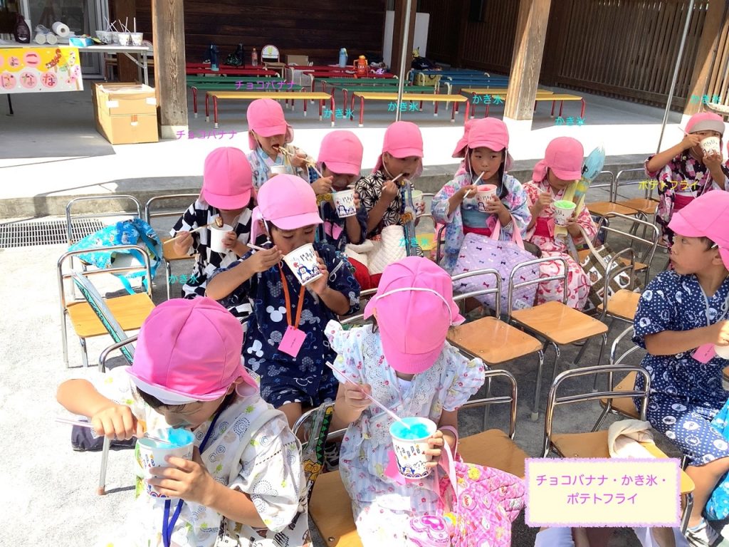 今年度のサマーフェスティバルも役員の皆さんにお手伝いいただきながら、子どもたちが中心となって開催でき楽しむことができました😆子どもたちが中心で行うことで、大きいお友だちが小さいお友だちに優しく声をかけたり手を貸してあげるなど、普段の保育の中でも行なっているたてわりの様子が見られました😄保護者の皆様から「サマーフェスティバルの様子が見たい」というご要望もあり今年度は、自由参観といたしました♬子どもたちが自由に楽しむ姿をご覧いただけたのではないでしょうか♬サマーフェスティバル中、あちらこちらから「楽しい!」「おいしい!」の声♬今年も大盛り上がりで開催することができました!役員の皆様、保護者の皆様ご理解、ご協力ありがとうございました😊