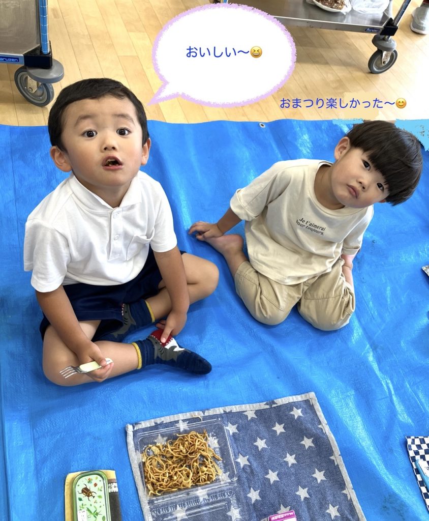 「あ〜♪楽しかった〜😆」「おなかペッコペコ〜😋」今日は特別メニュ〜お給食さんがお祭り風にパックに入れてくれました♬