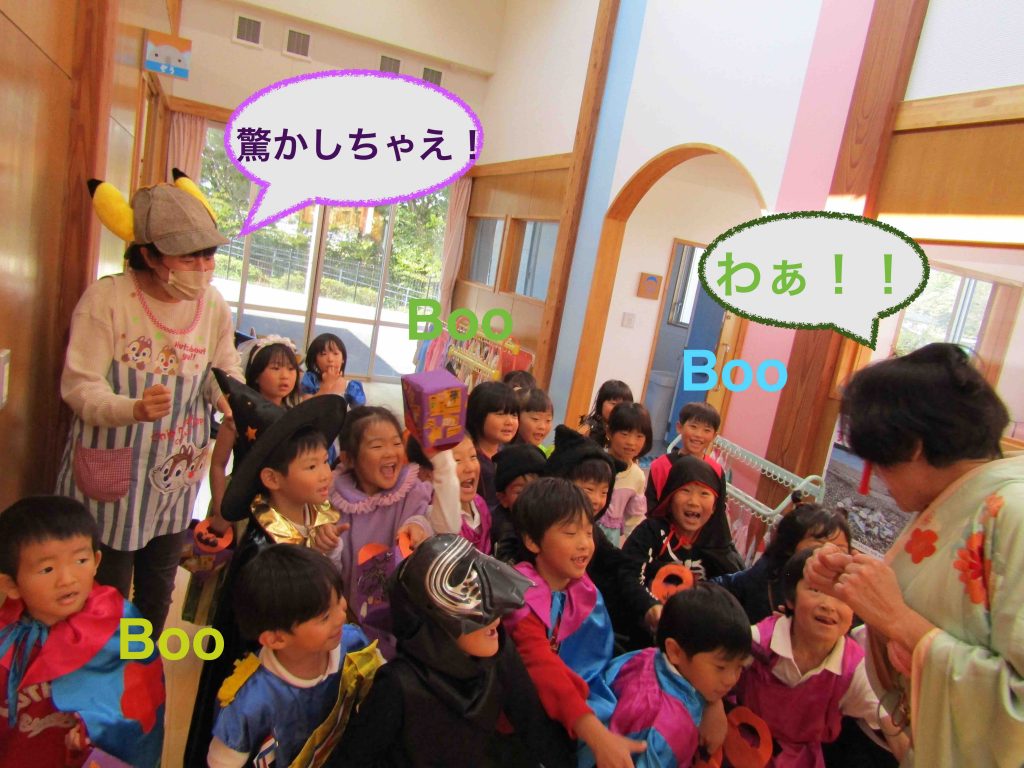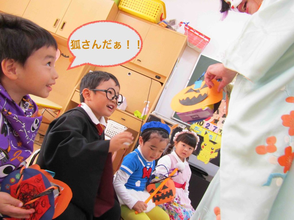 『ばぁ!!』キツネ軍団を驚かすお化けたち・・・。年長さんです👻驚かすはずが逆にびっくりさせられてしまったキツネさん‼️子どもたち、いい表情ですねぇ!!