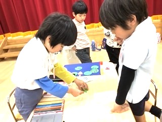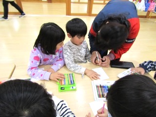 松ぼっくりのけん玉・どんぐりごま・木の実のマラカスなどなど・・・。それぞれペアになって遊び方を教えてもらいました。とって楽しそうに遊んでいますね。