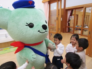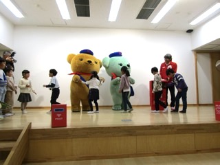 ハガキが完成した頃、何やらにぎやかなサンバのリズム🎶 ぽすくまくんだぁ!!子どもたちは大喜び😀🙌