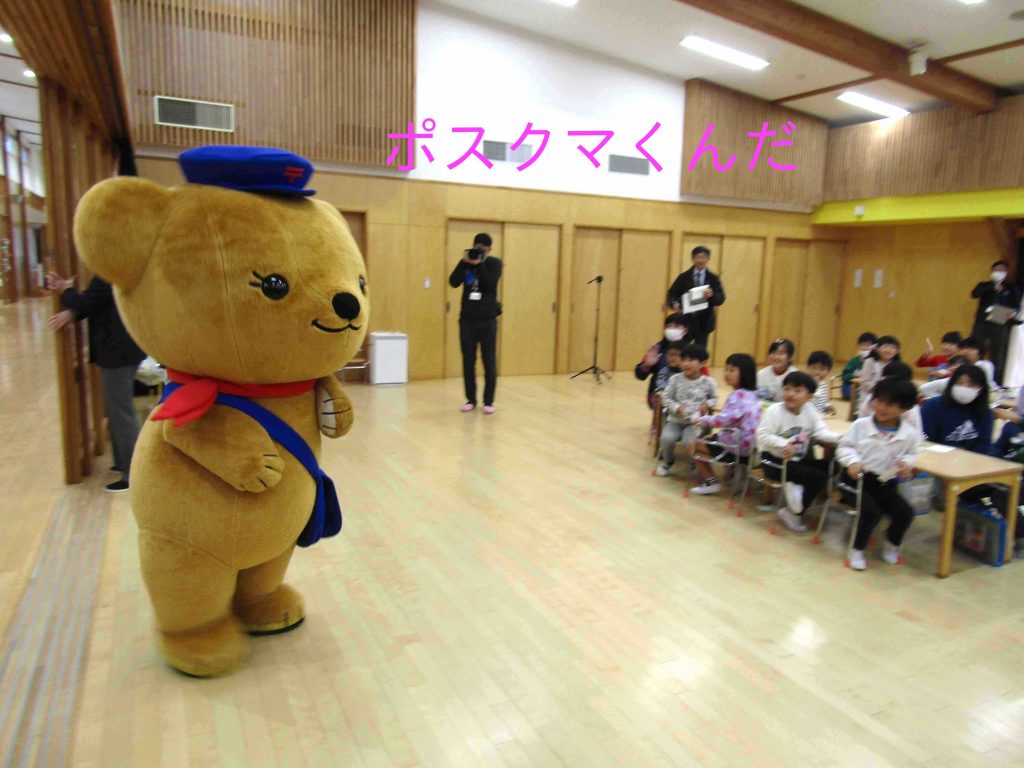書いたハガキをぽすくま君にお願いします!!小さなクラスのお手紙も預かってくれました!!ハガキはぽすくま君が配達してくれるそうですよ!!
