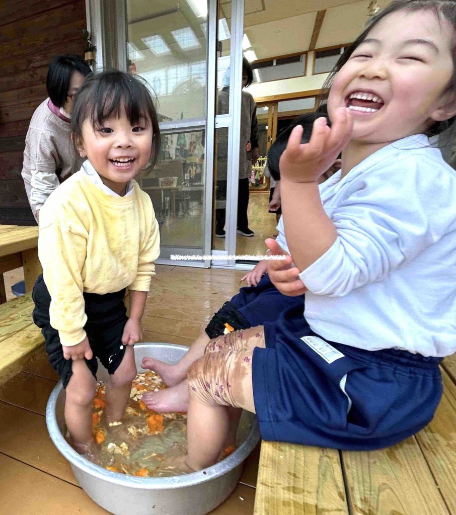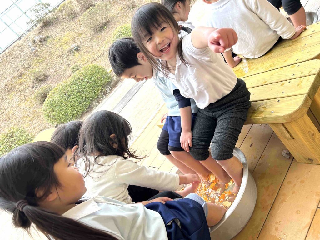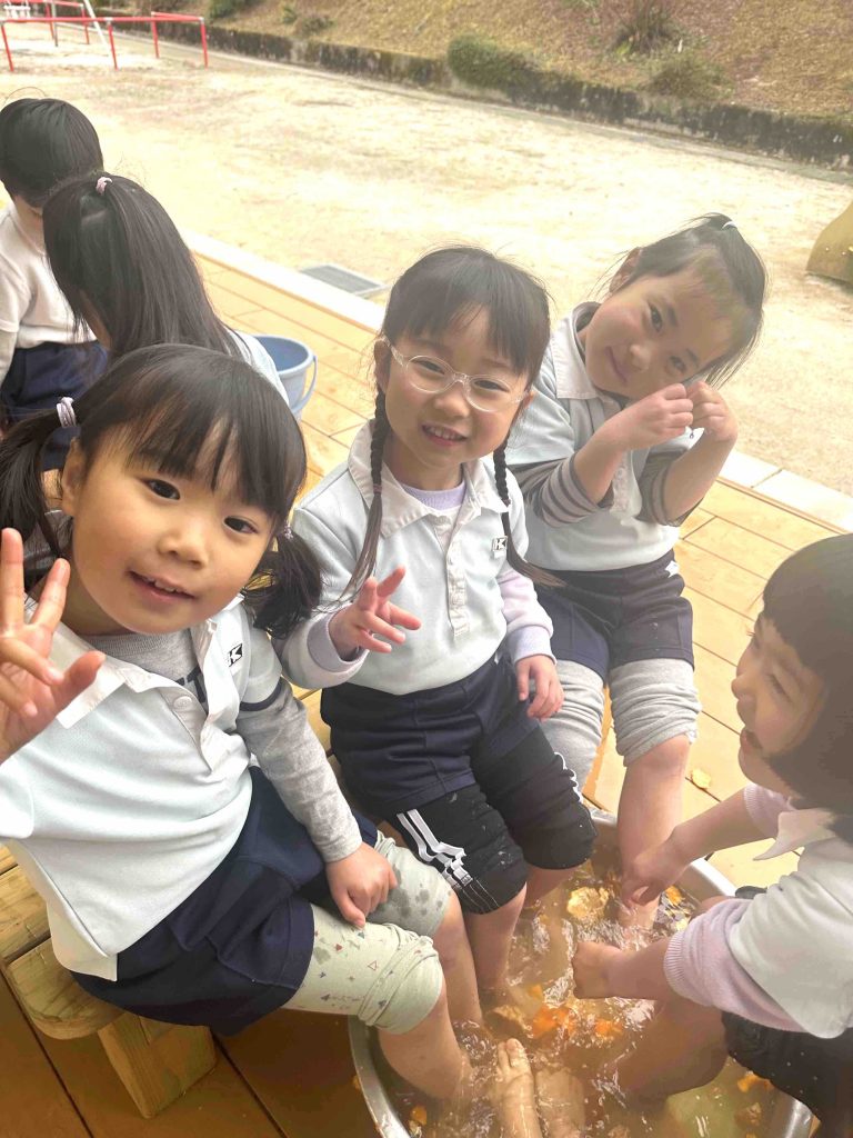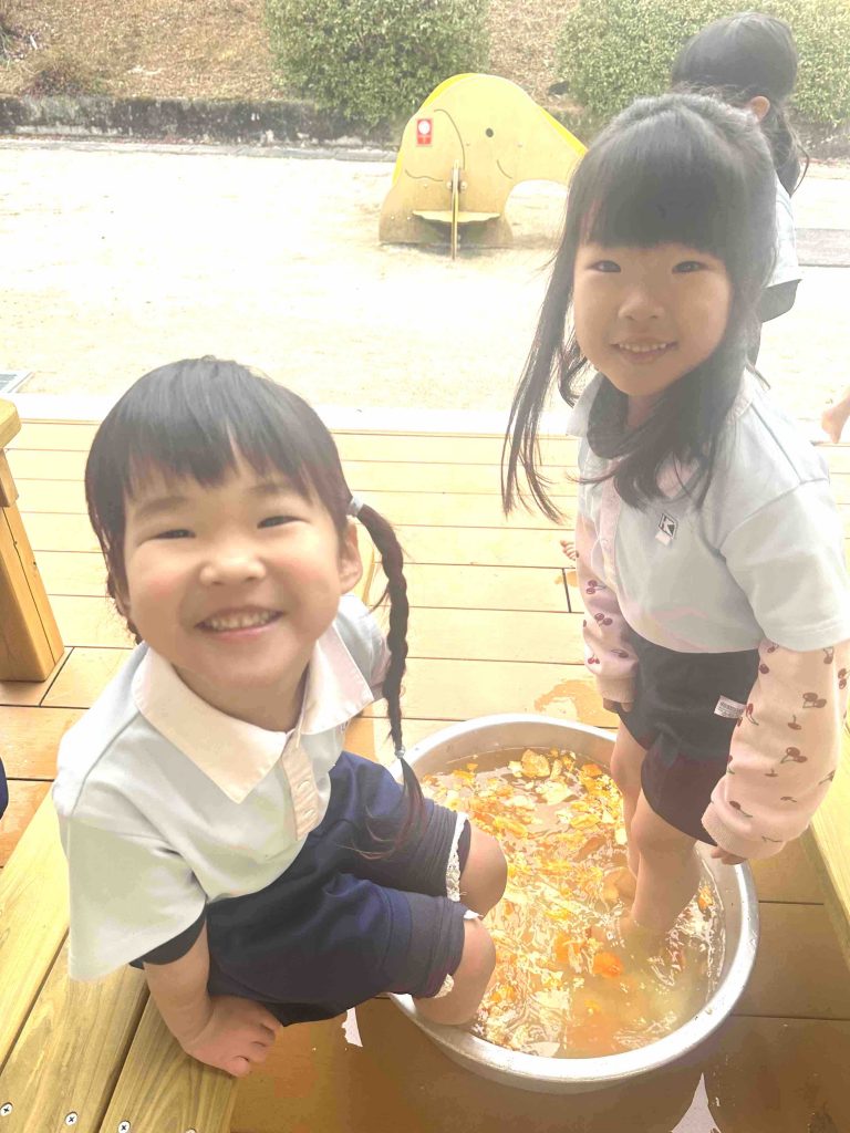 もったいないばあさんの絵本から、みかん風呂を知ったこあら組さん。給食で出たみかんの皮を取っておくことにしたみたいです🤭『だってもったいないばあさんが「もったいないことしてないかい?」って来ちゃうんだもん』ですって😆しっかり乾燥させた皮で作ったみかん風呂🍊冷えた体がポカポカに温まってし・あ・わ・せ❤️