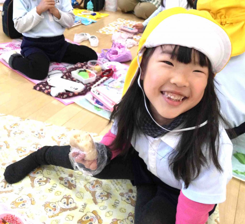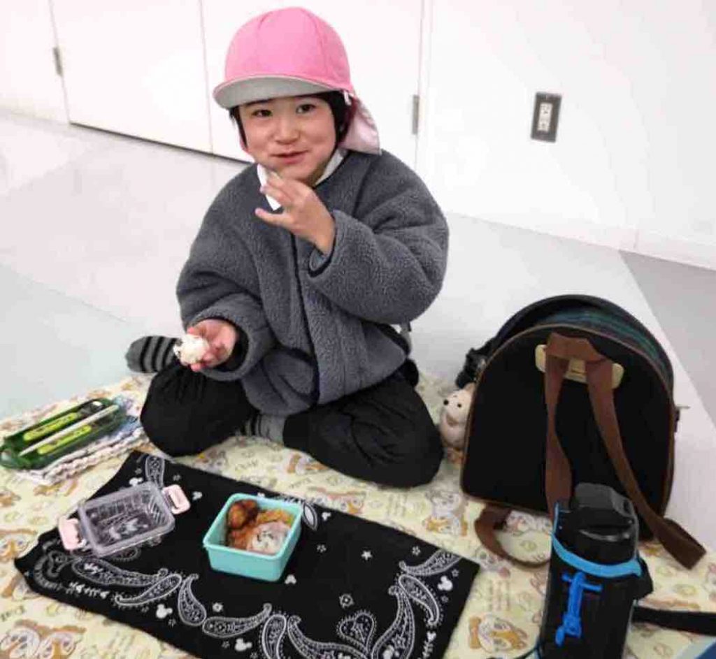 さぁ、お弁当を食べよう!!おうちの人の愛情たっぷりお弁当に舌鼓😋ほらいい笑顔(^.^)