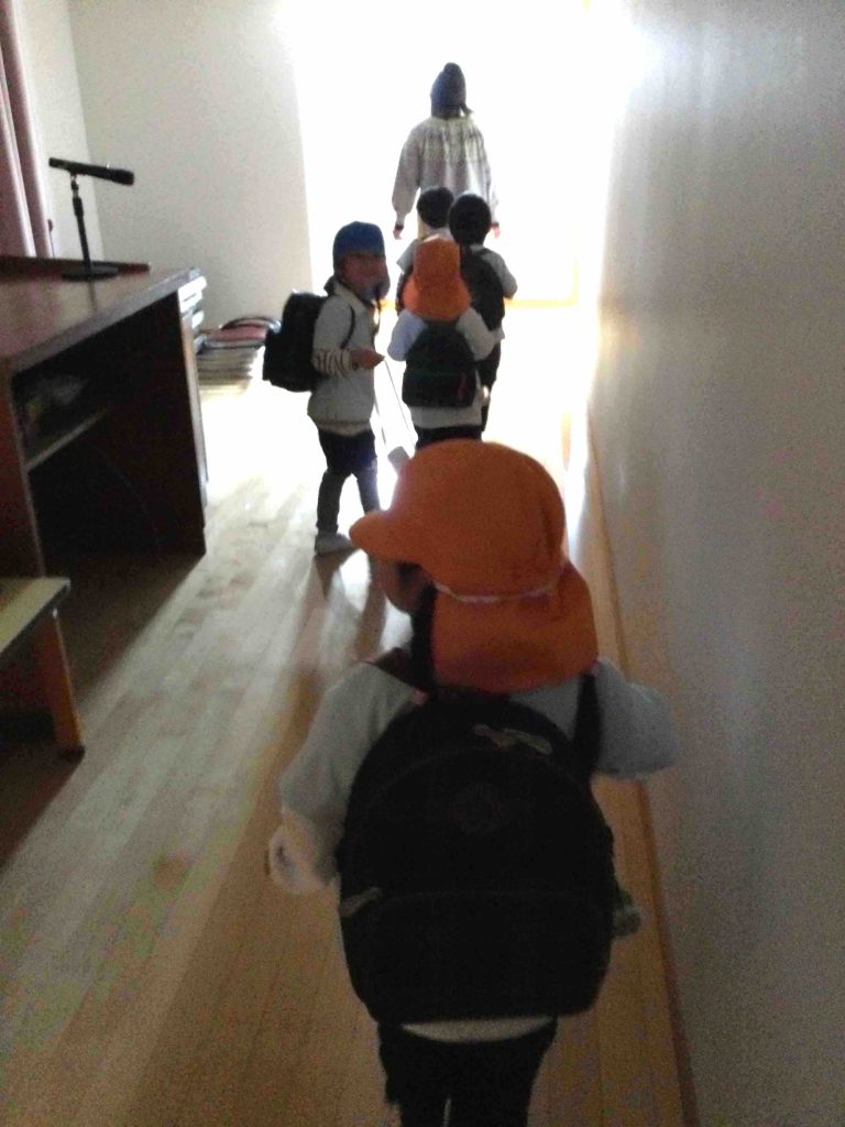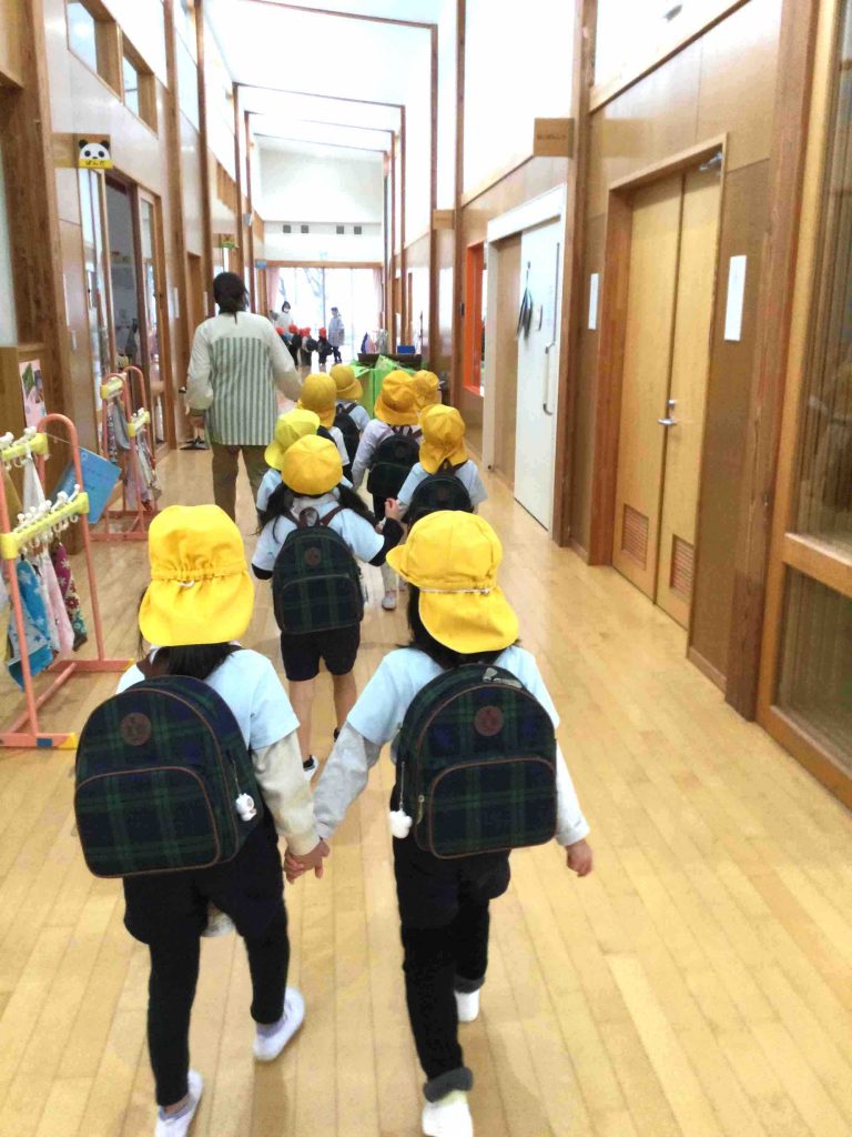 ぱんだ・こあら組さんと、きりん組さんはこども園探索🚶リュックを背負って進みます。雪が降っていたって平気平気!!