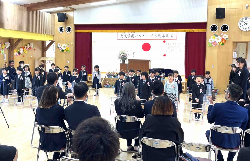 いなだこども園 最年長児の卒園式。お天気にも恵まれ心も晴れやかです。今日は、小さかった頃を振り返りながらおうちの人と門をくぐります。